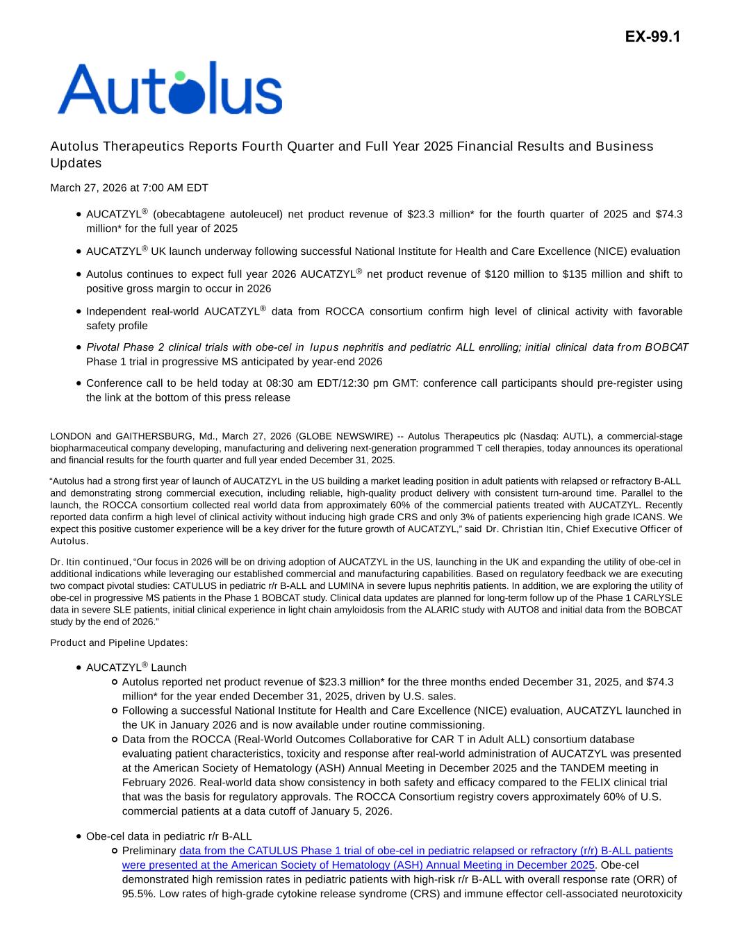 Autolus Therapeutics Reports Fourth Quarter and Full Year 2025 Financial Results and Business Updates March 27, 2026 at 7:00 AM EDT AUCATZYL® (obecabtagene autoleucel) net product revenue of $23.3 million* for the fourth quarter of 2025 and $74.3 million* for the full year of 2025 AUCATZYL® UK launch underway following successful National Institute for Health and Care Excellence (NICE) evaluation Autolus continues to expect full year 2026 AUCATZYL® net product revenue of $120 million to $135 million and shift to positive gross margin to occur in 2026 Independent real-world AUCATZYL® data from ROCCA consortium confirm high level of clinical activity with favorable safety profile Pivotal Phase 2 clinical trials with obe-cel in lupus nephritis and pediatric ALL enrolling; initial clinical data from BOBCAT Phase 1 trial in progressive MS anticipated by year-end 2026 Conference call to be held today at 08:30 am EDT/12:30 pm GMT: conference call participants should pre-register using the link at the bottom of this press release LONDON and GAITHERSBURG, Md., March 27, 2026 (GLOBE NEWSWIRE) -- Autolus Therapeutics plc (Nasdaq: AUTL), a commercial-stage biopharmaceutical company developing, manufacturing and delivering next-generation programmed T cell therapies, today announces its operational and financial results for the fourth quarter and full year ended December 31, 2025. “Autolus had a strong first year of launch of AUCATZYL in the US building a market leading position in adult patients with relapsed or refractory B-ALL and demonstrating strong commercial execution, including reliable, high-quality product delivery with consistent turn-around time. Parallel to the launch, the ROCCA consortium collected real world data from approximately 60% of the commercial patients treated with AUCATZYL. Recently reported data confirm a high level of clinical activity without inducing high grade CRS and only 3% of patients experiencing high grade ICANS. We expect this positive customer experience will be a key driver for the future growth of AUCATZYL,” said Dr. Christian Itin, Chief Executive Officer of Autolus. Dr. Itin continued, “Our focus in 2026 will be on driving adoption of AUCATZYL in the US, launching in the UK and expanding the utility of obe-cel in additional indications while leveraging our established commercial and manufacturing capabilities. Based on regulatory feedback we are executing two compact pivotal studies: CATULUS in pediatric r/r B-ALL and LUMINA in severe lupus nephritis patients. In addition, we are exploring the utility of obe-cel in progressive MS patients in the Phase 1 BOBCAT study. Clinical data updates are planned for long-term follow up of the Phase 1 CARLYSLE data in severe SLE patients, initial clinical experience in light chain amyloidosis from the ALARIC study with AUTO8 and initial data from the BOBCAT study by the end of 2026.” Product and Pipeline Updates: AUCATZYL® Launch Autolus reported net product revenue of $23.3 million* for the three months ended December 31, 2025, and $74.3 million* for the year ended December 31, 2025, driven by U.S. sales. Following a successful National Institute for Health and Care Excellence (NICE) evaluation, AUCATZYL launched in the UK in January 2026 and is now available under routine commissioning. Data from the ROCCA (Real-World Outcomes Collaborative for CAR T in Adult ALL) consortium database evaluating patient characteristics, toxicity and response after real-world administration of AUCATZYL was presented at the American Society of Hematology (ASH) Annual Meeting in December 2025 and the TANDEM meeting in February 2026. Real-world data show consistency in both safety and efficacy compared to the FELIX clinical trial that was the basis for regulatory approvals. The ROCCA Consortium registry covers approximately 60% of U.S. commercial patients at a data cutoff of January 5, 2026. Obe-cel data in pediatric r/r B-ALL Preliminary data from the CATULUS Phase 1 trial of obe-cel in pediatric relapsed or refractory (r/r) B-ALL patients were presented at the American Society of Hematology (ASH) Annual Meeting in December 2025. Obe-cel demonstrated high remission rates in pediatric patients with high-risk r/r B-ALL with overall response rate (ORR) of 95.5%. Low rates of high-grade cytokine release syndrome (CRS) and immune effector cell-associated neurotoxicity EX-99.1