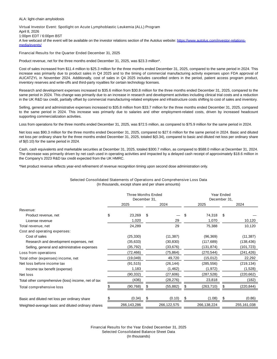 ALA: light-chain amyloidosis Virtual Investor Event: Spotlight on Acute Lymphoblastic Leukemia (ALL) Program April 8, 2026 1:00pm EDT / 6:00pm BST A live webcast of the event will be available on the investor relations section of the Autolus website: https://www.autolus.com/investor-relations- media/events/ Financial Results for the Quarter Ended December 31, 2025 Product revenue, net for the three months ended December 31, 2025, was $23.3 million*. Cost of sales increased from $11.4 million to $25.3 million for the three months ended December 31, 2025, compared to the same period in 2024. This increase was primarily due to product sales in Q4 2025 and to the timing of commercial manufacturing activity expenses upon FDA approval of AUCATZYL in November 2024. Additionally, cost of sales in Q4 2025 includes cancelled orders in the period, patient access program product, inventory reserves and write-offs and third-party royalties for certain technology licenses. Research and development expenses increased to $35.6 million from $30.8 million for the three months ended December 31, 2025, compared to the same period in 2024. This change was primarily due to an increase in research and development activities including clinical trial costs and a reduction in the UK R&D tax credit, partially offset by commercial manufacturing-related employee and infrastructure costs shifting to cost of sales and inventory. Selling, general and administrative expenses increased to $35.8 million from $33.7 million for the three months ended December 31, 2025, compared to the same period in 2024. This increase was primarily due to salaries and other employment-related costs, driven by increased headcount supporting commercialization activities. Loss from operations for the three months ended December 31, 2025, was $72.5 million, as compared to $75.9 million for the same period in 2024. Net loss was $90.3 million for the three months ended December 31, 2025, compared to $27.6 million for the same period in 2024. Basic and diluted net loss per ordinary share for the three months ended December 31, 2025, totaled $(0.34), compared to basic and diluted net loss per ordinary share of $(0.10) for the same period in 2024. Cash, cash equivalents and marketable securities at December 31, 2025, totaled $300.7 million, as compared to $588.0 million at December 31, 2024. The decrease was primarily driven by net cash used in operating activities and impacted by a delayed cash receipt of approximately $18.6 million in the Company's 2023 R&D tax credit expected from the UK HMRC. *Net product revenue reflects year-end refinement of revenue recognition timing upon second dose administration only. Selected Consolidated Statements of Operations and Comprehensive Loss Data (In thousands, except share and per share amounts) Three Months Ended December 31, Year Ended December 31, 2025 2024 2025 2024 Revenue: Product revenue, net $ 23,269 $ — $ 74,318 $ — License revenue 1,020 29 1,070 10,120 Total revenue, net 24,289 29 75,388 10,120 Cost and operating expenses: Cost of sales (25,330) (11,387) (96,369) (11,387) Research and development expenses, net (35,633) (30,830) (117,689) (138,436) Selling, general and administrative expenses (35,792) (33,676) (131,874) (101,723) Loss from operations (72,466) (75,864) (270,544) (241,426) Total other (expenses) income, net (19,049) 49,720 (15,012) 22,292 Net loss before income tax (91,515) (26,144) (285,556) (219,134) Income tax benefit (expense) 1,183 (1,462) (1,972) (1,528) Net loss (90,332) (27,606) (287,528) (220,662) Total other comprehensive (loss) income, net of tax (436) (28,276) 23,818 (182) Total comprehensive loss $ (90,768) $ (55,882) $ (263,710) $ (220,844) Basic and diluted net loss per ordinary share $ (0.34) $ (0.10) $ (1.08) $ (0.86) Weighted-average basic and diluted ordinary shares 266,143,286 266,122,575 266,138,224 255,161,038 Financial Results for the Year Ended December 31, 2025 Selected Consolidated Balance Sheet Data (In thousands)