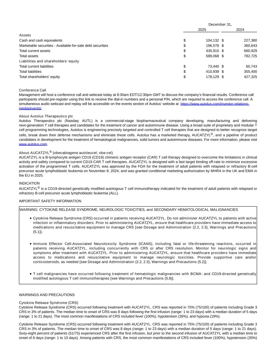 December 31, 2025 2024 Assets Cash and cash equivalents $ 104,132 $ 227,380 Marketable securities - Available-for-sale debt securities $ 196,578 $ 360,643 Total current assets $ 435,915 $ 660,929 Total assets $ 589,068 $ 782,725 Liabilities and shareholders' equity Total current liabilities $ 73,440 $ 60,743 Total liabilities $ 410,939 $ 355,400 Total shareholders' equity $ 178,129 $ 427,325 Conference Call Management will host a conference call and webcast today at 8:30am EDT/12:30pm GMT to discuss the company’s financial results. Conference call participants should pre-register using this link to receive the dial-in numbers and a personal PIN, which are required to access the conference call. A simultaneous audio webcast and replay will be accessible on the events section of Autolus’ website at https://www.autolus.com/investor-relations- media/events/. About Autolus Therapeutics plc Autolus Therapeutics plc (Nasdaq: AUTL) is a commercial-stage biopharmaceutical company developing, manufacturing and delivering next-generation T cell therapies and candidates for the treatment of cancer and autoimmune disease. Using a broad suite of proprietary and modular T cell programming technologies, Autolus is engineering precisely targeted and controlled T cell therapies that are designed to better recognize target cells, break down their defense mechanisms and eliminate these cells. Autolus has a marketed therapy, AUCATZYL®, and a pipeline of product candidates in development for the treatment of hematological malignancies, solid tumors and autoimmune diseases. For more information, please visit www.autolus.com. About AUCATZYL® (obecabtagene autoleucel; obe-cel) AUCATZYL is a B-lymphocyte antigen CD19 (CD19) chimeric antigen receptor (CAR) T cell therapy designed to overcome the limitations in clinical activity and safety compared to current CD19 CAR T cell therapies. AUCATZYL is designed with a fast target binding off-rate to minimize excessive activation of the programmed T cells. AUCATZYL was approved by the FDA for the treatment of adult patients with relapsed or refractory B-cell precursor acute lymphoblastic leukemia on November 8, 2024, and was granted conditional marketing authorization by MHRA in the UK and EMA in the EU in 2025. INDICATION AUCATZYL® is a CD19-directed genetically modified autologous T cell immunotherapy indicated for the treatment of adult patients with relapsed or refractory B-cell precursor acute lymphoblastic leukemia (ALL). IMPORTANT SAFETY INFORMATION WARNING: CYTOKINE RELEASE SYNDROME, NEUROLOGIC TOXICITIES, and SECONDARY HEMATOLOGICAL MALIGNANCIES Cytokine Release Syndrome (CRS) occurred in patients receiving AUCATZYL. Do not administer AUCATZYL to patients with active infection or inflammatory disorders. Prior to administering AUCATZYL, ensure that healthcare providers have immediate access to medications and resuscitative equipment to manage CRS [see Dosage and Administration (2.2, 2.3), Warnings and Precautions (5.1)]. Immune Effector Cell-Associated Neurotoxicity Syndrome (ICANS), including fatal or life-threatening reactions, occurred in patients receiving AUCATZYL, including concurrently with CRS or after CRS resolution. Monitor for neurologic signs and symptoms after treatment with AUCATZYL. Prior to administering AUCATZYL, ensure that healthcare providers have immediate access to medications and resuscitative equipment to manage neurologic toxicities. Provide supportive care and/or corticosteroids, as needed [see Dosage and Administration (2.2, 2.3), Warnings and Precautions (5.2)]. T cell malignancies have occurred following treatment of hematologic malignancies with BCMA- and CD19-directed genetically modified autologous T cell immunotherapies [see Warnings and Precautions (5.8)]. WARNINGS AND PRECAUTIONS Cytokine Release Syndrome (CRS) Cytokine Release Syndrome (CRS) occurred following treatment with AUCATZYL. CRS was reported in 75% (75/100) of patients including Grade 3 CRS in 3% of patients. The median time to onset of CRS was 8 days following the first infusion (range: 1 to 23 days) with a median duration of 5 days (range: 1 to 21 days). The most common manifestations of CRS included fever (100%), hypotension (35%), and hypoxia (19%). Cytokine Release Syndrome (CRS) occurred following treatment with AUCATZYL. CRS was reported in 75% (75/100) of patients including Grade 3 CRS in 3% of patients. The median time to onset of CRS was 8 days (range: 1 to 23 days) with a median duration of 5 days (range: 1 to 21 days). Sixty-eight percent of patients (51/75) experienced CRS after the first infusion, but prior to the second infusion of AUCATZYL with a median time to onset of 6 days (range: 1 to 10 days). Among patients with CRS, the most common manifestations of CRS included fever (100%), hypotension (35%)