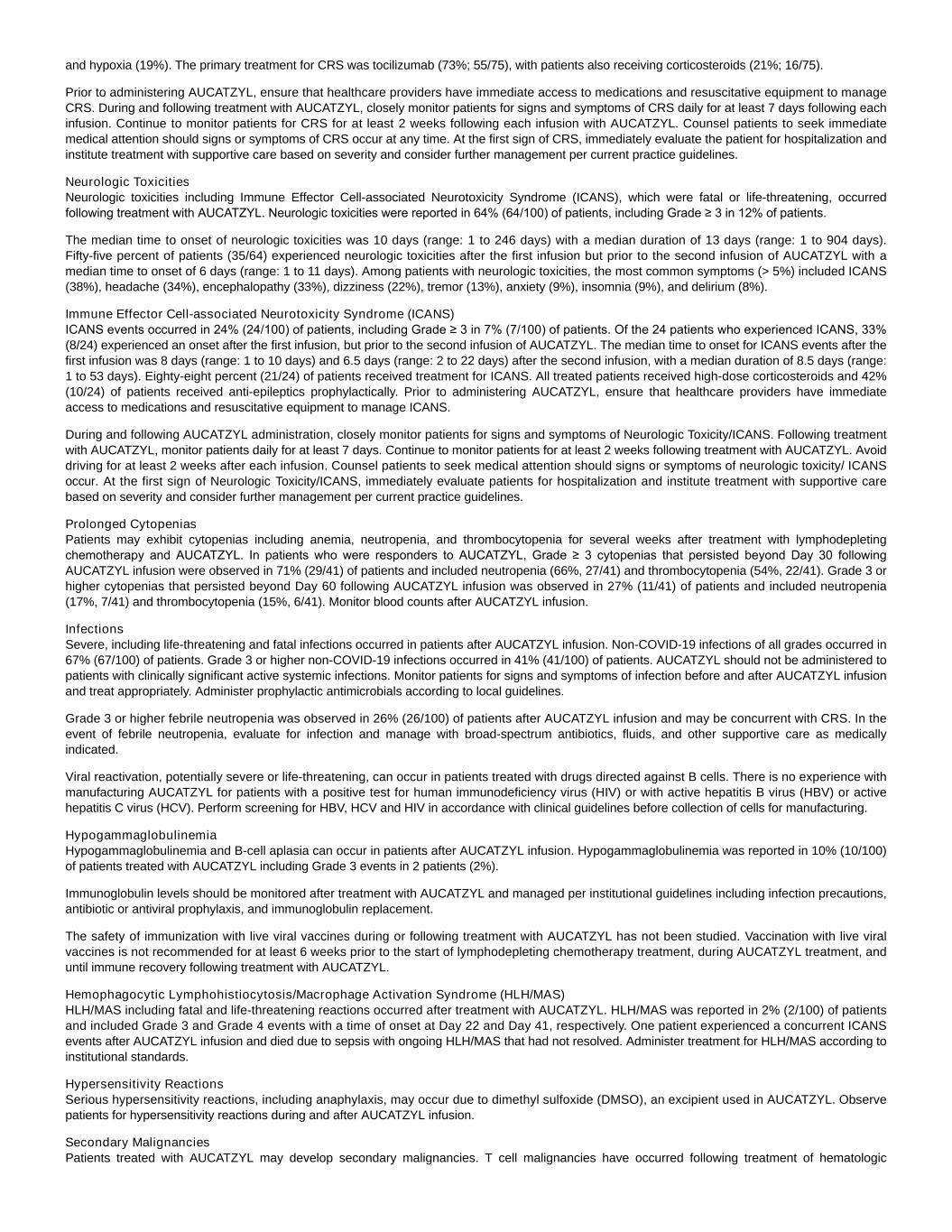 and hypoxia (19%). The primary treatment for CRS was tocilizumab (73%; 55/75), with patients also receiving corticosteroids (21%; 16/75). Prior to administering AUCATZYL, ensure that healthcare providers have immediate access to medications and resuscitative equipment to manage CRS. During and following treatment with AUCATZYL, closely monitor patients for signs and symptoms of CRS daily for at least 7 days following each infusion. Continue to monitor patients for CRS for at least 2 weeks following each infusion with AUCATZYL. Counsel patients to seek immediate medical attention should signs or symptoms of CRS occur at any time. At the first sign of CRS, immediately evaluate the patient for hospitalization and institute treatment with supportive care based on severity and consider further management per current practice guidelines. Neurologic Toxicities Neurologic toxicities including Immune Effector Cell-associated Neurotoxicity Syndrome (ICANS), which were fatal or life-threatening, occurred following treatment with AUCATZYL. Neurologic toxicities were reported in 64% (64/100) of patients, including Grade ≥ 3 in 12% of patients. The median time to onset of neurologic toxicities was 10 days (range: 1 to 246 days) with a median duration of 13 days (range: 1 to 904 days). Fifty-five percent of patients (35/64) experienced neurologic toxicities after the first infusion but prior to the second infusion of AUCATZYL with a median time to onset of 6 days (range: 1 to 11 days). Among patients with neurologic toxicities, the most common symptoms (> 5%) included ICANS (38%), headache (34%), encephalopathy (33%), dizziness (22%), tremor (13%), anxiety (9%), insomnia (9%), and delirium (8%). Immune Effector Cell-associated Neurotoxicity Syndrome (ICANS) ICANS events occurred in 24% (24/100) of patients, including Grade ≥ 3 in 7% (7/100) of patients. Of the 24 patients who experienced ICANS, 33% (8/24) experienced an onset after the first infusion, but prior to the second infusion of AUCATZYL. The median time to onset for ICANS events after the first infusion was 8 days (range: 1 to 10 days) and 6.5 days (range: 2 to 22 days) after the second infusion, with a median duration of 8.5 days (range: 1 to 53 days). Eighty-eight percent (21/24) of patients received treatment for ICANS. All treated patients received high-dose corticosteroids and 42% (10/24) of patients received anti-epileptics prophylactically. Prior to administering AUCATZYL, ensure that healthcare providers have immediate access to medications and resuscitative equipment to manage ICANS. During and following AUCATZYL administration, closely monitor patients for signs and symptoms of Neurologic Toxicity/ICANS. Following treatment with AUCATZYL, monitor patients daily for at least 7 days. Continue to monitor patients for at least 2 weeks following treatment with AUCATZYL. Avoid driving for at least 2 weeks after each infusion. Counsel patients to seek medical attention should signs or symptoms of neurologic toxicity/ ICANS occur. At the first sign of Neurologic Toxicity/ICANS, immediately evaluate patients for hospitalization and institute treatment with supportive care based on severity and consider further management per current practice guidelines. Prolonged Cytopenias Patients may exhibit cytopenias including anemia, neutropenia, and thrombocytopenia for several weeks after treatment with lymphodepleting chemotherapy and AUCATZYL. In patients who were responders to AUCATZYL, Grade ≥ 3 cytopenias that persisted beyond Day 30 following AUCATZYL infusion were observed in 71% (29/41) of patients and included neutropenia (66%, 27/41) and thrombocytopenia (54%, 22/41). Grade 3 or higher cytopenias that persisted beyond Day 60 following AUCATZYL infusion was observed in 27% (11/41) of patients and included neutropenia (17%, 7/41) and thrombocytopenia (15%, 6/41). Monitor blood counts after AUCATZYL infusion. Infections Severe, including life-threatening and fatal infections occurred in patients after AUCATZYL infusion. Non-COVID-19 infections of all grades occurred in 67% (67/100) of patients. Grade 3 or higher non-COVID-19 infections occurred in 41% (41/100) of patients. AUCATZYL should not be administered to patients with clinically significant active systemic infections. Monitor patients for signs and symptoms of infection before and after AUCATZYL infusion and treat appropriately. Administer prophylactic antimicrobials according to local guidelines. Grade 3 or higher febrile neutropenia was observed in 26% (26/100) of patients after AUCATZYL infusion and may be concurrent with CRS. In the event of febrile neutropenia, evaluate for infection and manage with broad-spectrum antibiotics, fluids, and other supportive care as medically indicated. Viral reactivation, potentially severe or life-threatening, can occur in patients treated with drugs directed against B cells. There is no experience with manufacturing AUCATZYL for patients with a positive test for human immunodeficiency virus (HIV) or with active hepatitis B virus (HBV) or active hepatitis C virus (HCV). Perform screening for HBV, HCV and HIV in accordance with clinical guidelines before collection of cells for manufacturing. Hypogammaglobulinemia Hypogammaglobulinemia and B-cell aplasia can occur in patients after AUCATZYL infusion. Hypogammaglobulinemia was reported in 10% (10/100) of patients treated with AUCATZYL including Grade 3 events in 2 patients (2%). Immunoglobulin levels should be monitored after treatment with AUCATZYL and managed per institutional guidelines including infection precautions, antibiotic or antiviral prophylaxis, and immunoglobulin replacement. The safety of immunization with live viral vaccines during or following treatment with AUCATZYL has not been studied. Vaccination with live viral vaccines is not recommended for at least 6 weeks prior to the start of lymphodepleting chemotherapy treatment, during AUCATZYL treatment, and until immune recovery fo