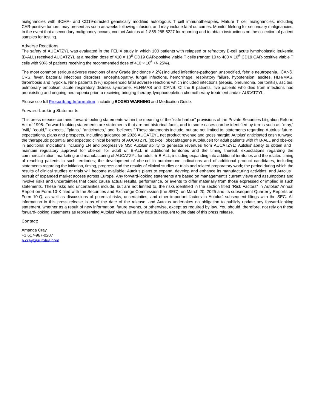 malignancies with BCMA- and CD19-directed genetically modified autologous T cell immunotherapies. Mature T cell malignancies, including CAR-positive tumors, may present as soon as weeks following infusion, and may include fatal outcomes. Monitor lifelong for secondary malignancies. In the event that a secondary malignancy occurs, contact Autolus at 1-855-288-5227 for reporting and to obtain instructions on the collection of patient samples for testing. Adverse Reactions The safety of AUCATZYL was evaluated in the FELIX study in which 100 patients with relapsed or refractory B-cell acute lymphoblastic leukemia (B-ALL) received AUCATZYL at a median dose of 410 × 106 CD19 CAR-positive viable T cells (range: 10 to 480 × 106 CD19 CAR-positive viable T cells with 90% of patients receiving the recommended dose of 410 × 106 +/- 25%). The most common serious adverse reactions of any Grade (incidence ≥ 2%) included infections-pathogen unspecified, febrile neutropenia, ICANS, CRS, fever, bacterial infectious disorders, encephalopathy, fungal infections, hemorrhage, respiratory failure, hypotension, ascites, HLH/MAS, thrombosis and hypoxia. Nine patients (9%) experienced fatal adverse reactions which included infections (sepsis, pneumonia, peritonitis), ascites, pulmonary embolism, acute respiratory distress syndrome, HLH/MAS and ICANS. Of the 9 patients, five patients who died from infections had pre-existing and ongoing neutropenia prior to receiving bridging therapy, lymphodepletion chemotherapy treatment and/or AUCATZYL. Please see full Prescribing Information, including BOXED WARNING and Medication Guide. Forward-Looking Statements This press release contains forward-looking statements within the meaning of the "safe harbor" provisions of the Private Securities Litigation Reform Act of 1995. Forward-looking statements are statements that are not historical facts, and in some cases can be identified by terms such as "may," "will," "could," "expects," "plans," "anticipates," and "believes." These statements include, but are not limited to, statements regarding Autolus’ future expectations, plans and prospects, including guidance on 2026 AUCATZYL net product revenue and gross margin; Autolus’ anticipated cash runway; the therapeutic potential and expected clinical benefits of AUCATZYL (obe-cel; obecabtagene autoleucel) for adult patients with r/r B-ALL and obe-cel in additional indications including LN and progressive MS; Autolus’ ability to generate revenues from AUCATZYL; Autolus’ ability to obtain and maintain regulatory approval for obe-cel for adult r/r B-ALL in additional territories and the timing thereof; expectations regarding the commercialization, marketing and manufacturing of AUCATZYL for adult r/r B-ALL, including expanding into additional territories and the related timing of reaching patients in such territories; the development of obe-cel in autoimmune indications and of additional product candidates, including statements regarding the initiation, timing, progress and the results of clinical studies or trials and related preparatory work; the period during which the results of clinical studies or trials will become available; Autolus’ plans to expand, develop and enhance its manufacturing activities; and Autolus’ pursuit of expanded market access across Europe. Any forward-looking statements are based on management's current views and assumptions and involve risks and uncertainties that could cause actual results, performance, or events to differ materially from those expressed or implied in such statements. These risks and uncertainties include, but are not limited to, the risks identified in the section titled "Risk Factors" in Autolus' Annual Report on Form 10-K filed with the Securities and Exchange Commission (the SEC), on March 20, 2025 and its subsequent Quarterly Reports on Form 10-Q, as well as discussions of potential risks, uncertainties, and other important factors in Autolus' subsequent filings with the SEC. All information in this press release is as of the date of the release, and Autolus undertakes no obligation to publicly update any forward-looking statement, whether as a result of new information, future events, or otherwise, except as required by law. You should, therefore, not rely on these forward-looking statements as representing Autolus’ views as of any date subsequent to the date of this press release. Contact: Amanda Cray +1 617-967-0207 a.cray@autolus.com