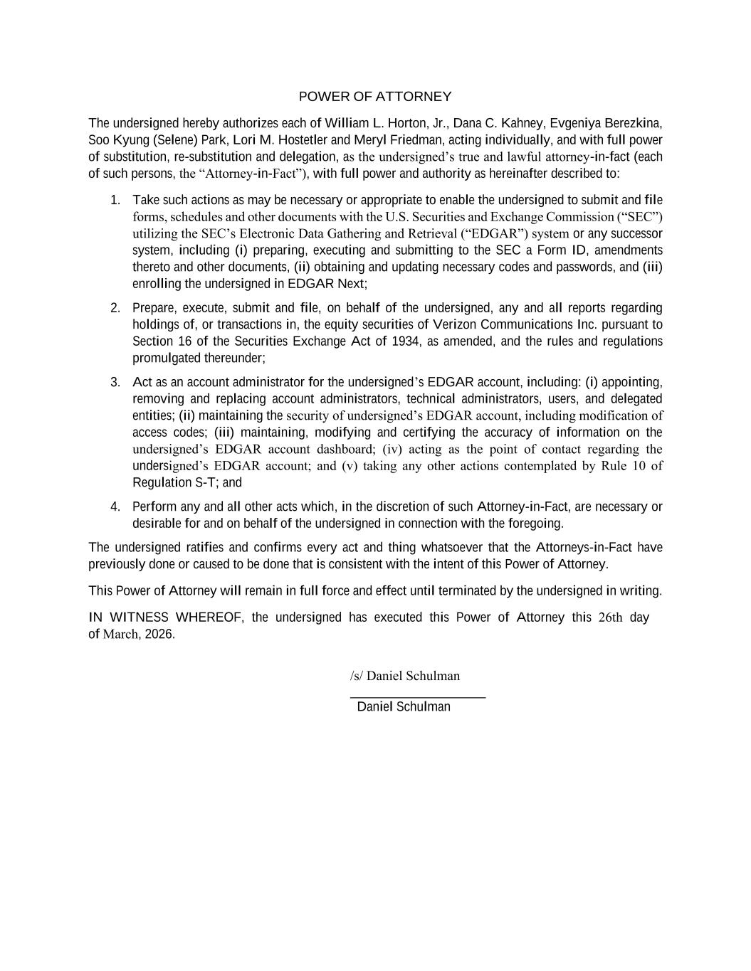 POWER OF ATTORNEY The undersigned hereby authorizes each of William L. Horton, Jr., Dana C. Kahney, Evgeniya Berezkina, Soo Kyung (Selene) Park, Lori M. Hostetler and Meryl Friedman, acting individually, and with full power of substitution, re-substitution and delegation, as the undersigned’s true and lawful attorney-in-fact (each of such persons, the “Attorney-in-Fact”), with full power and authority as hereinafter described to: 1. Take such actions as may be necessary or appropriate to enable the undersigned to submit and file forms, schedules and other documents with the U.S. Securities and Exchange Commission (“SEC”) utilizing the SEC’s Electronic Data Gathering and Retrieval (“EDGAR”) system or any successor system, including (i) preparing, executing and submitting to the SEC a Form ID, amendments thereto and other documents, (ii) obtaining and updating necessary codes and passwords, and (iii) enrolling the undersigned in EDGAR Next; 2. Prepare, execute, submit and file, on behalf of the undersigned, any and all reports regarding holdings of, or transactions in, the equity securities of Verizon Communications Inc. pursuant to Section 16 of the Securities Exchange Act of 1934, as amended, and the rules and regulations promulgated thereunder; 3. Act as an account administrator for the undersigned’s EDGAR account, including: (i) appointing, removing and replacing account administrators, technical administrators, users, and delegated entities; (ii) maintaining the security of undersigned’s EDGAR account, including modification of access codes; (iii) maintaining, modifying and certifying the accuracy of information on the undersigned’s EDGAR account dashboard; (iv) acting as the point of contact regarding the undersigned’s EDGAR account; and (v) taking any other actions contemplated by Rule 10 of Regulation S-T; and 4. Perform any and all other acts which, in the discretion of such Attorney-in-Fact, are necessary or desirable for and on behalf of the undersigned in connection with the foregoing. The undersigned ratifies and confirms every act and thing whatsoever that the Attorneys-in-Fact have previously done or caused to be done that is consistent with the intent of this Power of Attorney. This Power of Attorney will remain in full force and effect until terminated by the undersigned in writing. IN WITNESS WHEREOF, the undersigned has executed this Power of Attorney this 26th day of March, 2026. /s/ Daniel Schulman ____________________ Daniel Schulman