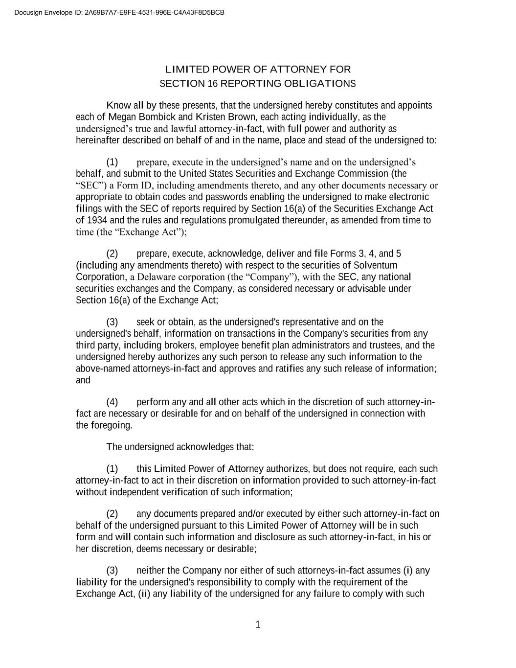 1 LIMITED POWER OF ATTORNEY FOR SECTION 16 REPORTING OBLIGATIONS Know all by these presents, that the undersigned hereby constitutes and appoints each of Megan Bombick and Kristen Brown, each acting individually, as the undersigned’s true and lawful attorney-in-fact, with full power and authority as hereinafter described on behalf of and in the name, place and stead of the undersigned to: (1) prepare, execute in the undersigned’s name and on the undersigned’s behalf, and submit to the United States Securities and Exchange Commission (the “SEC”) a Form ID, including amendments thereto, and any other documents necessary or appropriate to obtain codes and passwords enabling the undersigned to make electronic filings with the SEC of reports required by Section 16(a) of the Securities Exchange Act of 1934 and the rules and regulations promulgated thereunder, as amended from time to time (the “Exchange Act”); (2) prepare, execute, acknowledge, deliver and file Forms 3, 4, and 5 (including any amendments thereto) with respect to the securities of Solventum Corporation, a Delaware corporation (the “Company”), with the SEC, any national securities exchanges and the Company, as considered necessary or advisable under Section 16(a) of the Exchange Act; (3) seek or obtain, as the undersigned's representative and on the undersigned's behalf, information on transactions in the Company's securities from any third party, including brokers, employee benefit plan administrators and trustees, and the undersigned hereby authorizes any such person to release any such information to the above-named attorneys-in-fact and approves and ratifies any such release of information; and (4) perform any and all other acts which in the discretion of such attorney-in- fact are necessary or desirable for and on behalf of the undersigned in connection with the foregoing. The undersigned acknowledges that: (1) this Limited Power of Attorney authorizes, but does not require, each such attorney-in-fact to act in their discretion on information provided to such attorney-in-fact without independent verification of such information; (2) any documents prepared and/or executed by either such attorney-in-fact on behalf of the undersigned pursuant to this Limited Power of Attorney will be in such form and will contain such information and disclosure as such attorney-in-fact, in his or her discretion, deems necessary or desirable; (3) neither the Company nor either of such attorneys-in-fact assumes (i) any liability for the undersigned's responsibility to comply with the requirement of the Exchange Act, (ii) any liability of the undersigned for any failure to comply with such Docusign Envelope ID: 2A69B7A7-E9FE-4531-996E-C4A43F8D5BCB