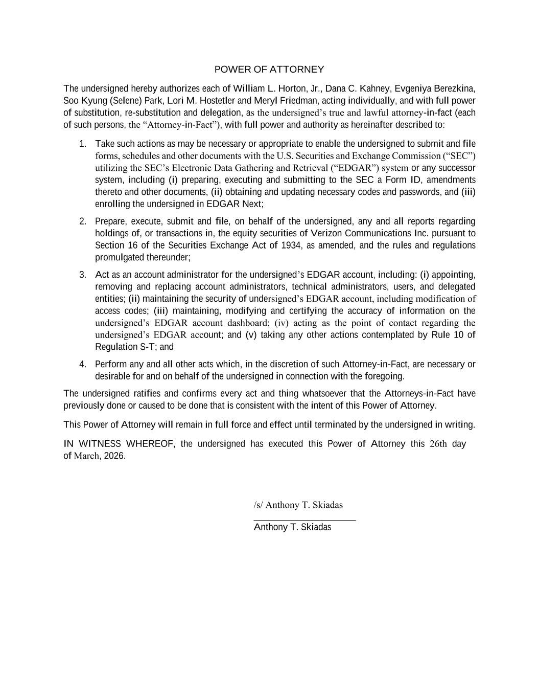 POWER OF ATTORNEY The undersigned hereby authorizes each of William L. Horton, Jr., Dana C. Kahney, Evgeniya Berezkina, Soo Kyung (Selene) Park, Lori M. Hostetler and Meryl Friedman, acting individually, and with full power of substitution, re-substitution and delegation, as the undersigned’s true and lawful attorney-in-fact (each of such persons, the “Attorney-in-Fact”), with full power and authority as hereinafter described to: 1. Take such actions as may be necessary or appropriate to enable the undersigned to submit and file forms, schedules and other documents with the U.S. Securities and Exchange Commission (“SEC”) utilizing the SEC’s Electronic Data Gathering and Retrieval (“EDGAR”) system or any successor system, including (i) preparing, executing and submitting to the SEC a Form ID, amendments thereto and other documents, (ii) obtaining and updating necessary codes and passwords, and (iii) enrolling the undersigned in EDGAR Next; 2. Prepare, execute, submit and file, on behalf of the undersigned, any and all reports regarding holdings of, or transactions in, the equity securities of Verizon Communications Inc. pursuant to Section 16 of the Securities Exchange Act of 1934, as amended, and the rules and regulations promulgated thereunder; 3. Act as an account administrator for the undersigned’s EDGAR account, including: (i) appointing, removing and replacing account administrators, technical administrators, users, and delegated entities; (ii) maintaining the security of undersigned’s EDGAR account, including modification of access codes; (iii) maintaining, modifying and certifying the accuracy of information on the undersigned’s EDGAR account dashboard; (iv) acting as the point of contact regarding the undersigned’s EDGAR account; and (v) taking any other actions contemplated by Rule 10 of Regulation S-T; and 4. Perform any and all other acts which, in the discretion of such Attorney-in-Fact, are necessary or desirable for and on behalf of the undersigned in connection with the foregoing. The undersigned ratifies and confirms every act and thing whatsoever that the Attorneys-in-Fact have previously done or caused to be done that is consistent with the intent of this Power of Attorney. This Power of Attorney will remain in full force and effect until terminated by the undersigned in writing. IN WITNESS WHEREOF, the undersigned has executed this Power of Attorney this 26th day of March, 2026. /s/ Anthony T. Skiadas _____________________ Anthony T. Skiadas