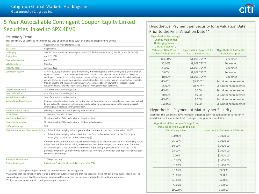 Preliminary Terms This summary of terms is not complete and should be read with the pricing supplement below Citigroup Global Markets Holdings Inc. Issuer: Citigroup Inc. Guarantor: S&P 500 Futures 40% Intraday Edge Volatility TCA 6% Decrement Index (USD) ER (ticker: SPXI4EV6) Underlying: April 17, 2026 Pricing date: April 17, 2031 Final valuation date: Monthly Valuation dates: April 22, 2031 Maturity date: At least 10.50% per annum*, paid monthly only if the closing value of the underlying is greater than or equal to its coupon barrier value on the related valuation date. You are not assured of receiving any contingent coupon. If the closing value of the underlying on one or more valuation dates is less than the coupon barrier value and, on a subsequent valuation date, the closing value of the underlying is greater than or equal to the coupon barrier value, your contingent coupon payment for that subsequent valuation date will include all previously unpaid contingent coupon payments. Contingent coupon: 75% of the initial underlying value Coupon barrier value: 85% of the initial underlying value Final buffer value: 90% of the initial underlying value Autocall barrier value: If on any potential autocall date the closing value of the underlying is greater than or equal to its autocall barrier value, the securities will be automatically called for an amount equal to the stated principal amount plus the related contingent coupon Automatic early redemption: Monthly on valuation dates beginning after one year Potential autocall dates: 17332VDZ4 / US17332VDZ40 CUSIP / ISIN: The closing value of the underlying on the pricing date Initial underlying value: The closing value of the underlying on the final valuation date Final underlying value: 15% Buffer percentage: • If the final underlying value is greater than or equal to the final buffer value : $1,000 • If the final underlying value is less than the final buffer value: $1,000 + [$1,000 × (the underlying return + the buffer percentage)] If the securities are not automatically redeemed prior to maturity and the final underlying value is less than the final buffer value, which means that the underlying has depreciated from the initial underlying value by more than the buffer percentage, you will lose 1% of the stated principal amount of your securities at maturity for every 1% by which that depreciation exceeds the buffer percentage. Payment at maturity (if not autocalled ): $1,000 per security Stated principal amount: Preliminary Pricing Supplement dated March 30, 2026 Pricing Supplement: * The actual contingent coupon rate will be determined on the pricing date. **Assumes that the valuation date is also a potential autocall date and that the securities have not been previously redeemed . T he hypotheticals assume that the contingent coupon will be set at the lowest value indicated in this offering summary. *** Plus any previously unpaid contingent coupon payments Citigroup Global Markets Holdings Inc. Guaranteed by Citigroup Inc. 5 Year Autocallable Contingent Coupon Equity Linked Securities linked to SPXI4EV6 Hypothetical Payment per Security for a Valuation Date Prior to the Final Valuation Date** Hypothetical Payment at Maturity Hypothetical Percentage Change from Initial Underlying Value to Final Underlying Value $1,000.00 100.00% $1,000.00 75.00% $1,000.00 50.00% $1,000.00 25.00% $1,000.00 0.00% $1,000.00 - 10.00% $1,000.00 - 15.00% $999.90 - 15.01% $900.00 - 25.00% $650.00 - 50.00% $400.00 - 75.00% $150.00 - 100.00% Assumes the securities have not been automatically redeemed prior to maturity and does not include the final contingent coupon payment, if any Hypothetical Automatic Early Redemption Hypothetical Payment for Such Valuation Date Hypothetical Percentage Change from Initial Underlying Value to Closing Value on a Valuation Date Prior to the Final Valuation Date Redeemed $1,008.75*** 100.00% Redeemed $1,008.75*** 50.00% Redeemed $1,008.75*** 25.00% Redeemed $1,008.75*** 0.00% Redeemed $1,008.75*** - 10.00% Securities not redeemed $8.75*** - 15.00% Securities not redeemed $8.75*** - 25.00% Securities not redeemed $0.00 - 25.01% Securities not redeemed $0.00 - 50.00% Securities not redeemed $0.00 - 75.00% Securities not redeemed $0.00 - 100.00% Hypothetical Payment at Maturity per Security