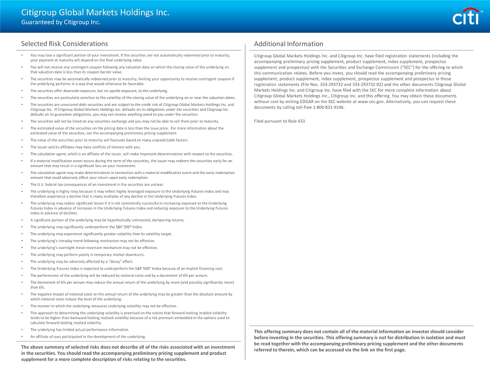 Selected Risk Considerations • You may lose a significant portion of your investment. If the securities are not automatically redeemed prior to maturity, your payment at maturity will depend on the final underlying value. • You will not receive any contingent coupon following any valuation date on which the closing value of the underlying on that valuation date is less than its coupon barrier value. • The securities may be automatically redeemed prior to maturity, limiting your opportunity to receive contingent coupons if the underlying performs in a way that would otherwise be favorable. • The securities offer downside exposure, but no upside exposure, to the underlying. • The securities are particularly sensitive to the volatility of the closing value of the underlying on or near the valuation d ate s. • The securities are unsecured debt securities and are subject to the credit risk of Citigroup Global Markets Holdings Inc. and Citigroup Inc. If Citigroup Global Markets Holdings Inc. defaults on its obligations under the securities and Citigroup Inc. defaults on its guarantee obligations, you may not receive anything owed to you under the securities. • The securities will not be listed on any securities exchange and you may not be able to sell them prior to maturity. • The estimated value of the securities on the pricing date is less than the issue price. For more information about the estimated value of the securities, see the accompanying preliminary pricing supplement. • The value of the securities prior to maturity will fluctuate based on many unpredictable factors. • The issuer and its affiliates may have conflicts of interest with you. • The calculation agent, which is an affiliate of the issuer, will make important determinations with respect to the securities . • If a material modification event occurs during the term of the securities, the issuer may redeem the securities early for an amount that may result in a significant loss on your investment. • The calculation agent may make determinations in connection with a material modification event and the early redemption amount that could adversely affect your return upon early redemption. • The U.S. federal tax consequences of an investment in the securities are unclear. • The underlying is highly risky because it may reflect highly leveraged exposure to the Underlying Futures Index and may therefore experience a decline that is many multiples of any decline in the Underlying Futures Index. • The underlying may realize significant losses if it is not consistently successful in increasing exposure to the Underlying Futures Index in advance of increases in the Underlying Futures Index and reducing exposure to the Underlying Futures Index in advance of declines. • A significant portion of the underlying may be hypothetically uninvested, dampening returns. • The underlying may significantly underperform the S&P 500® Index. • The underlying may experience significantly greater volatility than its volatility target. • The underlying’s intraday trend - following mechanism may not be effective. • The underlying’s overnight mean - reversion mechanism may not be effective. • The underlying may perform poorly in temporary market downturns. • The underlying may be adversely affected by a “decay” effect. • The Underlying Futures Index is expected to underperform the S&P 500® Index because of an implicit financing cost. • The performance of the underlying will be reduced by notional costs and by a decrement of 6% per annum. • The decrement of 6% per annum may reduce the annual return of the underlying by more (and possibly significantly more) than 6%. • The negative impact of notional costs on the annual return of the underlying may be greater than the absolute amount by which notional costs reduce the level of the underlying. • The manner in which the underlying measures underlying volatility may not be effective. • This approach to determining the underlying volatility is premised on the notion that forward - looking implied volatility tends to be higher than backward - looking realized volatility because of a risk premium embedded in the options used to calculate forward - looking implied volatility. • The underlying has limited actual performance information. • An affiliate of ours participated in the development of the underlying. The above summary of selected risks does not describe all of the risks associated with an investment in the securities. You should read the accompanying preliminary pricing supplement and product supplement for a more complete description of risks relating to the securities. Additional Information Citigroup Global Markets Holdings Inc. and Citigroup Inc. have filed registration statements (including the accompanying preliminary pricing supplement, product supplement, index supplement, prospectus supplement and prospectus) with the Securities and Exchange Commission (“SEC”) for the offering to which this communication relates. Before you invest, you should read the accompanying preliminary pricing supplement, product supplement, index supplement, prospectus supplement and prospectus in those registration statements (File Nos. 333 - 293732 and 333 - 293732 - 02) and the other documents Citigroup Global Markets Holdings Inc. and Citigroup Inc. have filed with the SEC for more complete information about Citigroup Global Markets Holdings Inc., Citigroup Inc. and this offering. You may obtain these documents without cost by visiting EDGAR on the SEC website at www.sec.gov. Alternatively, you can request these documents by calling toll - free 1 - 800 - 831 - 9146. Filed pursuant to Rule 433 This offering summary does not contain all of the material information an investor should consider before investing in the securities. This offering summary is not for distribution in isolation and must be read together with the accompanying preliminary pri