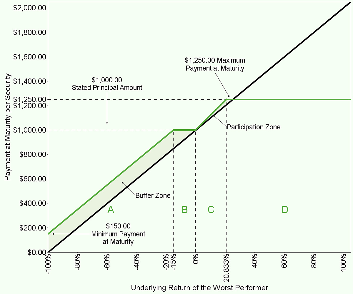 If the final underlying value of the worst performer is less than or equal to its initial underlying value but greater than or equal to its final buffer value: $1,000