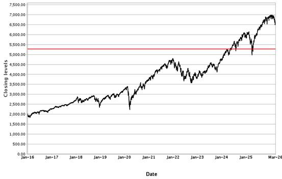 The following graph sets forth historical closing values of the Underlier for the period from January 1, 2016 to March 25, 2026. The red line represents the Buffer Value. We obtained the information in the graph from Bloomberg Financial Markets, without independent investigation. We cannot give you assurance that the performance of the Underlier will result in the return of all of your initial investment.