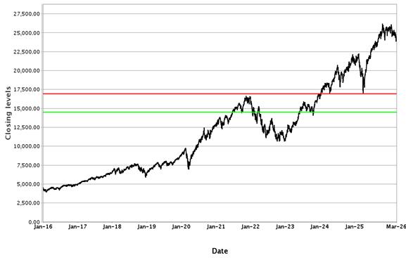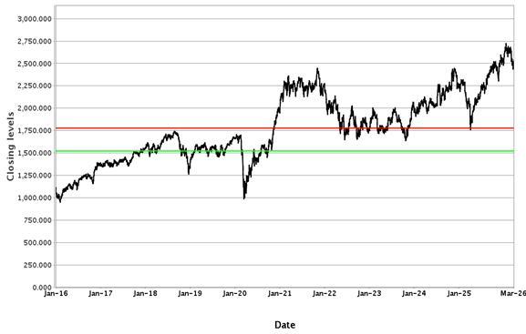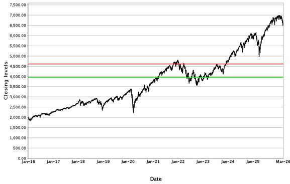 The following graphs set forth historical closing values of the Underliers for the period from January 1, 2016 to March 25, 2026. Each red line represents a hypothetical Coupon Threshold and each green line represents a hypothetical Barrier Value, in each case based on the closing value of the relevant Underlier on March 25, 2026. We obtained the information in the graphs from Bloomberg Financial Markets, without independent investigation. We cannot give you assurance that the performance of the Underliers will result in the return of all of your initial investment.