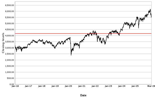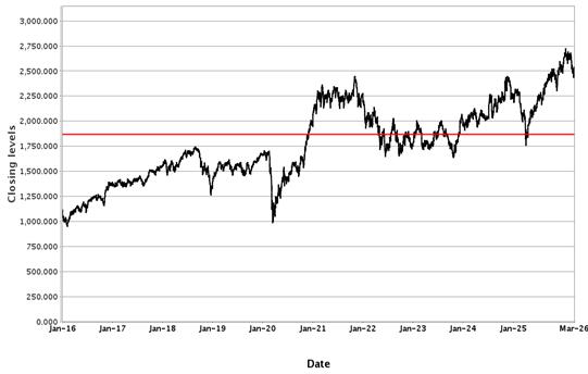 The following graphs set forth historical closing values of the Underliers for the period from January 1, 2016 to March 26, 2026. Each red line represents a hypothetical Coupon Threshold and Barrier Value based on the closing value of the relevant Underlier on March 26, 2026. We obtained the information in the graphs from Bloomberg Financial Markets, without independent investigation. We cannot give you assurance that the performance of the Underliers will result in the return of all of your initial investment.