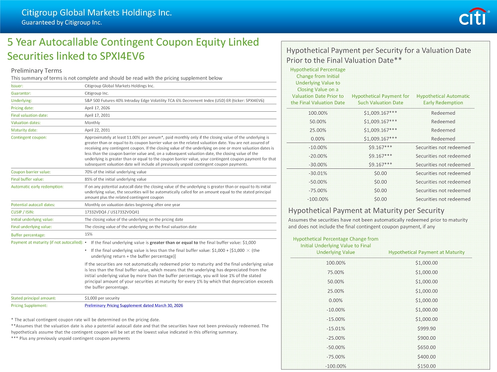 Preliminary Terms This summary of terms is not complete and should be read with the pricing supplement below Citigroup Global Markets Holdings Inc. Issuer: Citigroup Inc. Guarantor: S&P 500 Futures 40% Intraday Edge Volatility TCA 6% Decrement Index (USD) ER (ticker: SPXI4EV6) Underlying: April 17, 2026 Pricing date: April 17, 2031 Final valuation date: Monthly Valuation dates: April 22, 2031 Maturity date: Approximately at least 11.00% per annum*, paid monthly only if the closing value of the underlying is greater than or equal to its coupon barrier value on the related valuation date. You are not assured of receiving any contingent coupon. If the closing value of the underlying on one or more valuation dates is less than the coupon barrier value and, on a subsequent valuation date, the closing value of the underlying is greater than or equal to the coupon barrier value, your contingent coupon payment for that subsequent valuation date will include all previously unpaid contingent coupon payments. Contingent coupon: 70% of the initial underlying value Coupon barrier value: 85% of the initial underlying value Final buffer value: If on any potential autocall date the closing value of the underlying is greater than or equal to its initial underlying value, the securities will be automatically called for an amount equal to the stated principal amount plus the related contingent coupon Automatic early redemption: Monthly on valuation dates beginning after one year Potential autocall dates: 17332VDQ4 / US17332VDQ41 CUSIP / ISIN: The closing value of the underlying on the pricing date Initial underlying value: The closing value of the underlying on the final valuation date Final underlying value: 15% Buffer percentage: • If the final underlying value is greater than or equal to the final buffer value : $1,000 • If the final underlying value is less than the final buffer value: $1,000 + [$1,000 × (the underlying return + the buffer percentage)] If the securities are not automatically redeemed prior to maturity and the final underlying value is less than the final buffer value, which means that the underlying has depreciated from the initial underlying value by more than the buffer percentage, you will lose 1% of the stated principal amount of your securities at maturity for every 1% by which that depreciation exceeds the buffer percentage. Payment at maturity (if not autocalled ): $1,000 per security Stated principal amount: Preliminary Pricing Supplement dated March 30, 2026 Pricing Supplement: * The actual contingent coupon rate will be determined on the pricing date. **Assumes that the valuation date is also a potential autocall date and that the securities have not been previously redeemed . T he hypotheticals assume that the contingent coupon will be set at the lowest value indicated in this offering summary. *** Plus any previously unpaid contingent coupon payments Citigroup Global Markets Holdings Inc. Guaranteed by Citigroup Inc. 5 Year Autocallable Contingent Coupon Equity Linked Securities linked to SPXI4EV6 Hypothetical Payment per Security for a Valuation Date Prior to the Final Valuation Date** Hypothetical Payment at Maturity Hypothetical Percentage Change from Initial Underlying Value to Final Underlying Value $1,000.00 100.00% $1,000.00 75.00% $1,000.00 50.00% $1,000.00 25.00% $1,000.00 0.00% $1,000.00 - 10.00% $1,000.00 - 15.00% $999.90 - 15.01% $900.00 - 25.00% $650.00 - 50.00% $400.00 - 75.00% $150.00 - 100.00% Assumes the securities have not been automatically redeemed prior to maturity and does not include the final contingent coupon payment, if any Hypothetical Automatic Early Redemption Hypothetical Payment for Such Valuation Date Hypothetical Percentage Change from Initial Underlying Value to Closing Value on a Valuation Date Prior to the Final Valuation Date Redeemed $1,009.167*** 100.00% Redeemed $1,009.167*** 50.00% Redeemed $1,009.167*** 25.00% Redeemed $1,009.167*** 0.00% Securities not redeemed $9.167*** - 10.00% Securities not redeemed $9.167*** - 20.00 % Securities not redeemed $9.167*** - 30.00% Securities not redeemed $0.00 - 30.01% Securities not redeemed $0.00 - 50.00% Securities not redeemed $0.00 - 75.00% Securities not redeemed $0.00 - 100.00% Hypothetical Payment at Maturity per Security