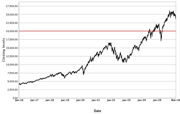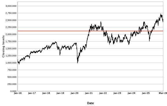 The following graphs set forth historical closing values of the Underlier for each offering for the period from January 1, 2016 to March 26, 2026. Each red line represents the Buffer Value. We obtained the information in the graphs from Bloomberg Financial Markets, without independent investigation. We cannot give you assurance that the performance of the Underlier will result in the return of all of your initial investment.