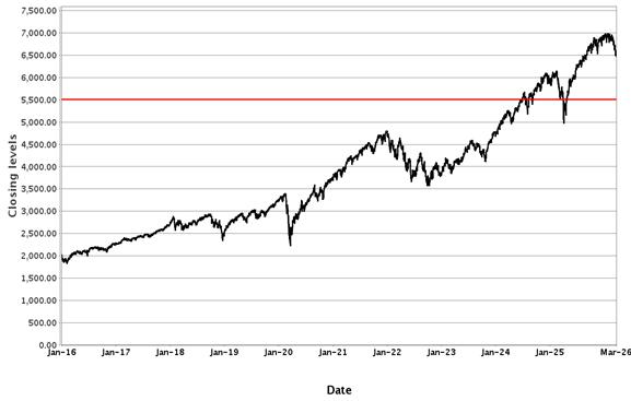 The following graph sets forth historical closing values of the Underlier for the period from January 1, 2016 to March 26, 2026. The red line represents the Buffer Value. We obtained the information in the graph from Bloomberg Financial Markets, without independent investigation. We cannot give you assurance that the performance of the Underlier will result in the return of all of your initial investment.
