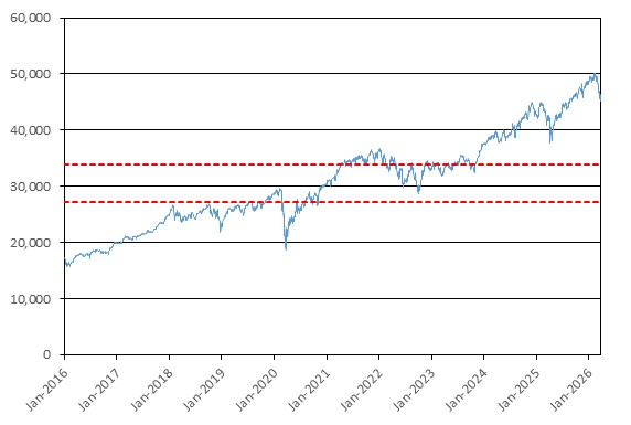 The graph below illustrates the performance of INDU from January 1, 2016 through March 27, 2026, based on the daily closing levels as reported by Bloomberg, without independent verification. UBS has not conducted any independent review or due diligence of any publicly available information obtained from Bloomberg. The closing level of INDU on March 27, 2026 was 45,166.64. The dotted lines represent its coupon barrier of 33,874.98, which is equal to 75.00% of its initial level, and its downside threshold of 27,099.98, which is equal to 60.00% of its initial level. Past performance of the underlying asset is not indicative of the future performance of the underlying asset during the term of the Notes.