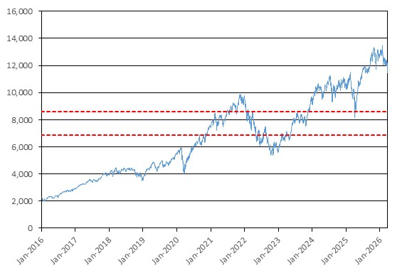 The graph below illustrates the performance of NDXT from January 1, 2016 through March 27, 2026, based on the daily closing levels as reported by Bloomberg, without independent verification. UBS has not conducted any independent review or due diligence of any publicly available information obtained from Bloomberg. The closing level of NDXT on March 27, 2026 was 11,455.22. The dotted lines represent its coupon barrier of 8,591.42, which is equal to 75.00% of its initial level, and its downside threshold of 6,873.13, which is equal to 60.00% of its initial level. Past performance of the underlying asset is not indicative of the future performance of the underlying asset during the term of the Notes.
