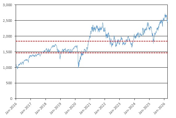 The graph below illustrates the performance of RTY from January 1, 2016 through March 27, 2026, based on the daily closing levels as reported by Bloomberg, without independent verification. UBS has not conducted any independent review or due diligence of any publicly available information obtained from Bloomberg. The closing level of RTY on March 27, 2026 was 2,449.695. The dotted lines represent its coupon barrier of 1,837.271, which is equal to 75.00% of its initial level, and its downside threshold of 1,469.817, which is equal to 60.00% of its initial level. Past performance of the underlying asset is not indicative of the future performance of the underlying asset during the term of the Notes.