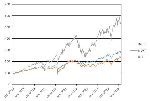 The graph below illustrates the daily performance of the underlying assets from January 1, 2016 through March 27, 2026. For comparison purposes, each underlying asset has been normalized to have a closing level of 100.00 on January 1, 2016 by dividing the closing level of that underlying asset on each trading day by the closing level of that underlying asset on January 1, 2016 and multiplying by 100.00. We obtained the closing levels used to determine the normalized closing levels set forth below from Bloomberg, without independent verification.