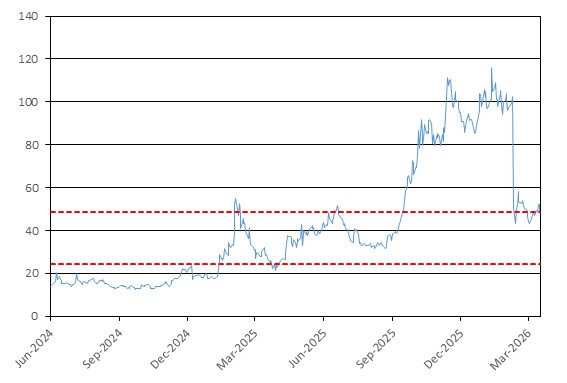 The graph below illustrates the performance of GRAIL’s common stock from June 12, 2024 through March 27, 2026, based on the daily closing levels as reported by Bloomberg, without independent verification. UBS has not conducted any independent review or due diligence of any publicly available information obtained from Bloomberg. The closing level of GRAIL’s common stock on March 27, 2026 was $48.49. The dotted lines respectively represent the call threshold level of $48.49, which is equal to 100.00% of the initial level, and the downside threshold of $24.25, which is equal to 50.00% of the initial level. Past performance of the underlying asset is not indicative of the future performance of the underlying asset during the term of the Notes.
