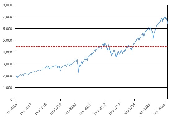 The graph below illustrates the performance of SPX from January 1, 2016 through March 27, 2026, based on the daily closing levels as reported by Bloomberg, without independent verification. UBS has not conducted any independent review or due diligence of any publicly available information obtained from Bloomberg. The closing level of SPX on March 27, 2026 was 6,368.85. The dotted line represents the coupon barrier and downside threshold of 4,458.20, which is equal to 70.00% of the initial level. Past performance of the underlying asset is not indicative of the future performance of the underlying asset during the term of the Notes.
