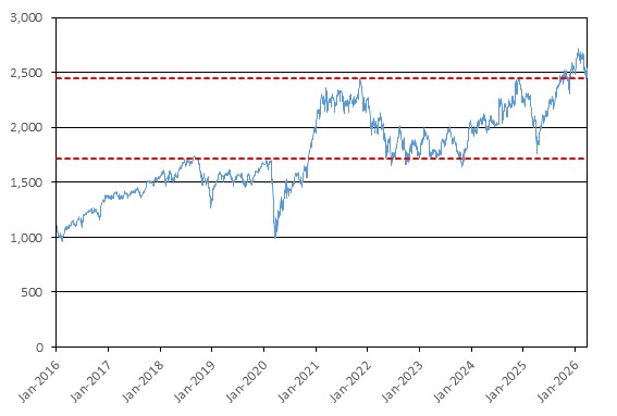 The graph below illustrates the performance of RTY from January 1, 2016 through March 27, 2026, based on the daily closing levels as reported by Bloomberg, without independent verification. UBS has not conducted any independent review or due diligence of any publicly available information obtained from Bloomberg. The closing level of RTY on March 27, 2026 was 2,449.695. The dotted lines respectively represent its call threshold level of 2,449.695, which is equal to 100.00% of its initial level, and its coupon barrier and downside threshold of 1,714.787, which is equal to 70.00% of its initial level. Past performance of the underlying asset is not indicative of the future performance of the underlying asset during the term of the Notes.