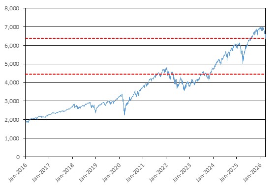 The graph below illustrates the performance of SPX from January 1, 2016 through March 27, 2026, based on the daily closing levels as reported by Bloomberg, without independent verification. UBS has not conducted any independent review or due diligence of any publicly available information obtained from Bloomberg. The closing level of SPX on March 27, 2026 was 6,368.85. The dotted lines respectively represent its call threshold level of 6,368.85, which is equal to 100.00% of its initial level, and its coupon barrier and downside threshold of 4,458.20, which is equal to 70.00% of its initial level. Past performance of the underlying asset is not indicative of the future performance of the underlying asset during the term of the Notes.