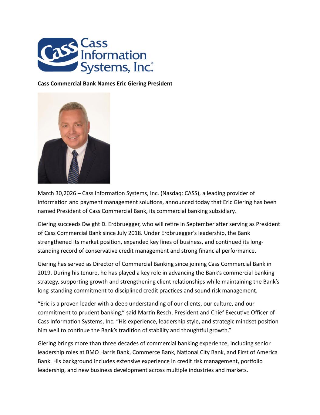 Cass Commercial Bank Names Eric Giering President March 30,2026 – Cass Information Systems, Inc. (Nasdaq: CASS), a leading provider of information and payment management solutions, announced today that Eric Giering has been named President of Cass Commercial Bank, its commercial banking subsidiary. Giering succeeds Dwight D. Erdbruegger, who will retire in September after serving as President of Cass Commercial Bank since July 2018. Under Erdbruegger’s leadership, the Bank strengthened its market position, expanded key lines of business, and continued its long- standing record of conservative credit management and strong financial performance. Giering has served as Director of Commercial Banking since joining Cass Commercial Bank in 2019. During his tenure, he has played a key role in advancing the Bank’s commercial banking strategy, supporting growth and strengthening client relationships while maintaining the Bank’s long-standing commitment to disciplined credit practices and sound risk management. “Eric is a proven leader with a deep understanding of our clients, our culture, and our commitment to prudent banking,” said Martin Resch, President and Chief Executive Officer of Cass Information Systems, Inc. “His experience, leadership style, and strategic mindset position him well to continue the Bank’s tradition of stability and thoughtful growth.” Giering brings more than three decades of commercial banking experience, including senior leadership roles at BMO Harris Bank, Commerce Bank, National City Bank, and First of America Bank. His background includes extensive experience in credit risk management, portfolio leadership, and new business development across multiple industries and markets.