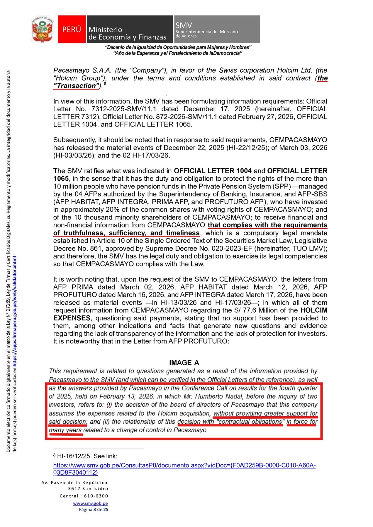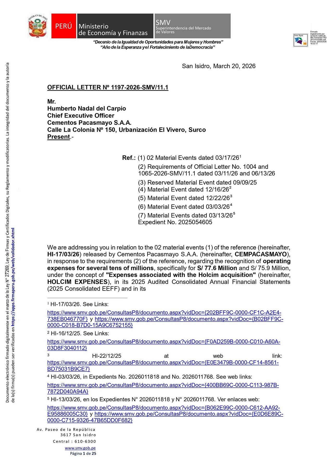 PERÚ Ministerio de Economía y Finanzas Av. Pa s eo de la Re pú bl i ca 3 617 S a n I s i dr o C entr a l : 610 - 630 0 www.smv.gob.pe Página 1 de 25 SMV Superintendencia del Mercado de Valores Firmado Digitalmente por: GODOS GARCIA Alix Fernando FAU 20131016396 soft Fecha: 20/03/2026 16:53:17 “Decenio de la Igualdad de Oportunidades para Mujeresy Hombres” “Año de la Esperanza yel Fortalecimiento de laDemocracia” San Isidro, March 20, 2026 OFFICIAL LETTER Nº 1197 - 2026 - SMV/11.1 Mr. Humberto Nadal del Carpio Chief Executive Officer Cementos Pacasmayo S.A.A. Calle La Colonia Nº 150, Urbanización El Vivero, Surco Present . - Ref.: (1) 02 Material Events dated 03/17/26 1 (2) Requirements of Official Letter No. 1004 and 1065 - 2026 - SMV/11.1 dated 03/11/26 and 06/13/26 (3) Reserved Material Event dated 09/09/25 (4) Material Event dated 12/16/26 ² (5) Material Event dated 12/22/26 ³ (6) Material Event dated 03/03/26 ⁴ (7) Material Events dated 03/13/26 ⁵ Expedient No. 2025054605 We are addressing you in relation to the 02 material events ( 1 ) of the reference (hereinafter, HI - 17 / 03 / 26 ) released by Cementos Pacasmayo S . A . A . (hereinafter, CEMPACASMAYO ), in response to the requirements ( 2 ) of the reference, regarding the recognition of operating expenses for several tens of millions , specifically for S/ 77 . 6 Million and S/ 75 . 9 Million, under the concept of "Expenses associated with the Holcim acquisition" (hereinafter, HOLCIM EXPENSES ), in its 2025 Audited Consolidated Annual Financial Statements ( 2025 Consolidated EEFF) and in its 1 HI - 17/03/26. See Links: https://www.smv.gob.pe/ConsultasP8/documento.aspx?vidDoc={202BFF9C - 0000 - CF1C - A2E4 - 738EB046770F} y https://www.smv.gob.pe/ConsultasP8/documento.aspx?vidDoc={B02BFF9C - 0000 - C018 - B7D0 - 15A9C6752155} 2 HI - 16/12/25. See Links: https://www.smv.gob.pe/ConsultasP8/documento.aspx?vidDoc={F0AD259B - 0000 - C010 - A60A - 03D8F3040112} 3 HI - 22/12/25 at web link: https://www.smv.gob.pe/ConsultasP8/documento.aspx?vidDoc={E0E3479B - 0000 - CF14 - 8561 - BD75031B9CE7} 4 HI - 03/03/26, in Expedients No. 2026011818 and No. 2026011768. See web links: https:// www.smv.gob.pe/ConsultasP8/documento.aspx?vidDoc= {400BB69C - 0000 - C113 - 987B - 7872D040A94A} 5 HI - 13/03/26, en los Expedientes N 2026011818 y N 2026011768. Ver enlaces web: https://www.smv.gob.pe/ConsultasP8/documento.aspx?vidDoc={B062E99C - 0000 - C612 - AA92 - E95886005C30} y https://www.smv.gob.pe/ConsultasP8/documento.aspx?vidDoc={E0D6E89C - 0000 - C715 - 9326 - 47B65DD0F682}