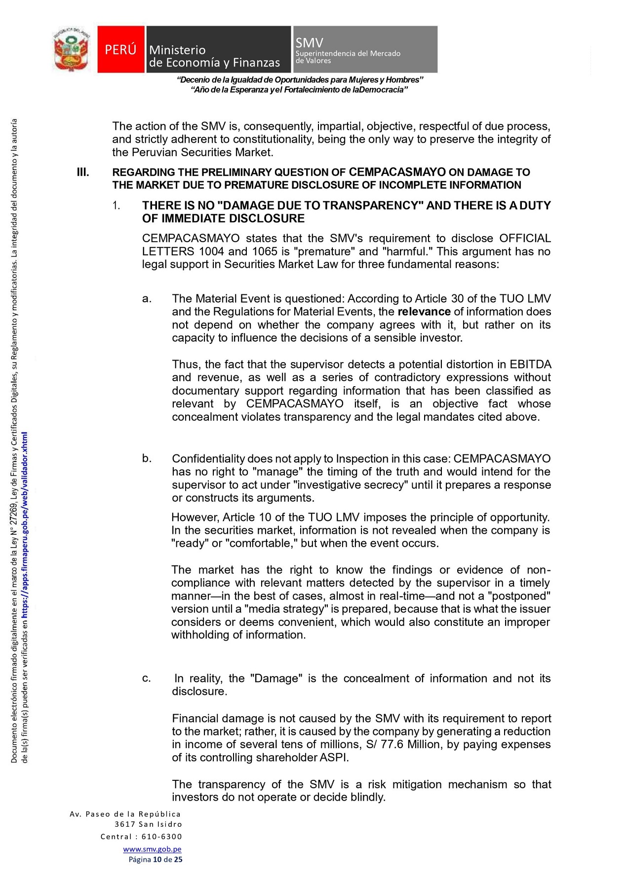 PERÚ Ministerio de Economía y Finanzas Av. Pa s eo de la Re pú bl i ca 3 617 S a n I s i dr o C entr a l : 610 - 630 0 www.smv.gob.pe Página 10 de 25 SMV Superintendencia del Mercado de Valores “Decenio de la Igualdad de Oportunidades para Mujeresy Hombres” “Año de la Esperanza yel Fortalecimiento de laDemocracia” The action of the SMV is, consequently, impartial, objective, respectful of due process, and strictly adherent to constitutionality, being the only way to preserve the integrity of the Peruvian Securities Market . REGARDING THE PRELIMINARY QUESTION OF CEMPACASMAYO ON DAMAGE TO THE MARKET DUE TO PREMATURE DISCLOSURE OF INCOMPLETE INFORMATION III. 1. THERE IS NO "DAMAGE DUE TO TRANSPARENCY" AND THERE IS A DUTY OF IMMEDIATE DISCLOSURE CEMPACASMAYO states that the SMV's requirement to disclose OFFICIAL LETTERS 1004 and 1065 is "premature" and "harmful . " This argument has no legal support in Securities Market Law for three fundamental reasons : a. The Material Event is questioned : According to Article 30 of the TUO LMV and the Regulations for Material Events, the relevance of information does not depend on whether the company agrees with it, but rather on its capacity to influence the decisions of a sensible investor . Thus, the fact that the supervisor detects a potential distortion in EBITDA and revenue, as well as a series of contradictory expressions without documentary support regarding information that has been classified as relevant by CEMPACASMAYO itself, is an objective fact whose concealment violates transparency and the legal mandates cited above . b. Confidentiality does not apply to Inspection in this case : CEMPACASMAYO has no right to "manage" the timing of the truth and would intend for the supervisor to act under "investigative secrecy" until it prepares a response or constructs its arguments . However, Article 10 of the TUO LMV imposes the principle of opportunity . In the securities market, information is not revealed when the company is "ready" or "comfortable," but when the event occurs . The market has the right to know the findings or evidence of non - compliance with relevant matters detected by the supervisor in a timely manner — in the best of cases, almost in real - time — and not a "postponed" version until a "media strategy" is prepared, because that is what the issuer considers or deems convenient, which would also constitute an improper withholding of information . c. In reality, the "Damage" is the concealment of information and not its disclosure. Financial damage is not caused by the SMV with its requirement to report to the market ; rather, it is caused by the company by generating a reduction in income of several tens of millions, S/ 77 . 6 Million, by paying expenses of its controlling shareholder ASPI . The transparency of the SMV is a risk mitigation mechanism so that investors do not operate or decide blindly .