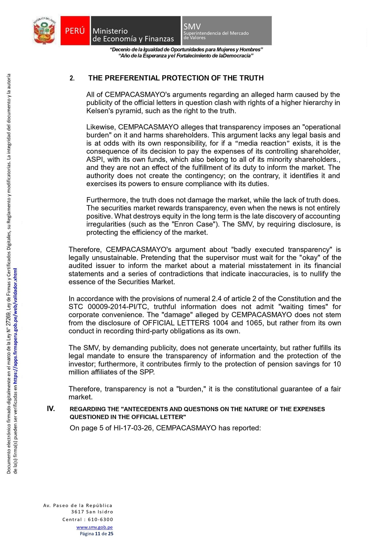 PERÚ Ministerio de Economía y Finanzas Av. Pa s eo de la Re pú bl i ca 3 617 S a n I s i dr o C entr a l : 610 - 630 0 www.smv.gob.pe Página 11 de 25 SMV Superintendencia del Mercado de Valores “Decenio de la Igualdad de Oportunidades para Mujeresy Hombres” “Año de la Esperanza yel Fortalecimiento de laDemocracia” 2. THE PREFERENTIAL PROTECTION OF THE TRUTH All of CEMPACASMAYO's arguments regarding an alleged harm caused by the publicity of the official letters in question clash with rights of a higher hierarchy in Kelsen's pyramid, such as the right to the truth . Likewise, CEMPACASMAYO alleges that transparency imposes an "operational burden" on it and harms shareholders . This argument lacks any legal basis and is at odds with its own responsibility, for if a “ media reaction ” exists, it is the consequence of its decision to pay the expenses of its controlling shareholder, ASPI, with its own funds, which also belong to all of its minority shareholders . , and they are not an effect of the fulfillment of its duty to inform the market . The authority does not create the contingency ; on the contrary, it identifies it and exercises its powers to ensure compliance with its duties . Furthermore, the truth does not damage the market, while the lack of truth does . The securities market rewards transparency, even when the news is not entirely positive . What destroys equity in the long term is the late discovery of accounting irregularities (such as the "Enron Case") . The SMV, by requiring disclosure, is protecting the efficiency of the market . Therefore, CEMPACASMAYO's argument about "badly executed transparency" is legally unsustainable . Pretending that the supervisor must wait for the "okay" of the audited issuer to inform the market about a material misstatement in its financial statements and a series of contradictions that indicate inaccuracies, is to nullify the essence of the Securities Market . In accordance with the provisions of numeral 2 . 4 of article 2 of the Constitution and the STC 00009 - 2014 - PI/TC, truthful information does not admit "waiting times" for corporate convenience . The "damage" alleged by CEMPACASMAYO does not stem from the disclosure of OFFICIAL LETTERS 1004 and 1065 , but rather from its own conduct in recording third - party obligations as its own . The SMV, by demanding publicity, does not generate uncertainty, but rather fulfills its legal mandate to ensure the transparency of information and the protection of the investor ; furthermore, it contributes firmly to the protection of pension savings for 10 million affiliates of the SPP . Therefore, transparency is not a "burden," it is the constitutional guarantee of a fair market. REGARDING THE "ANTECEDENTS AND QUESTIONS ON THE NATURE OF THE EXPENSES QUESTIONED IN THE OFFICIAL LETTER" On page 5 of HI - 17 - 03 - 26, CEMPACASMAYO has reported: IV.