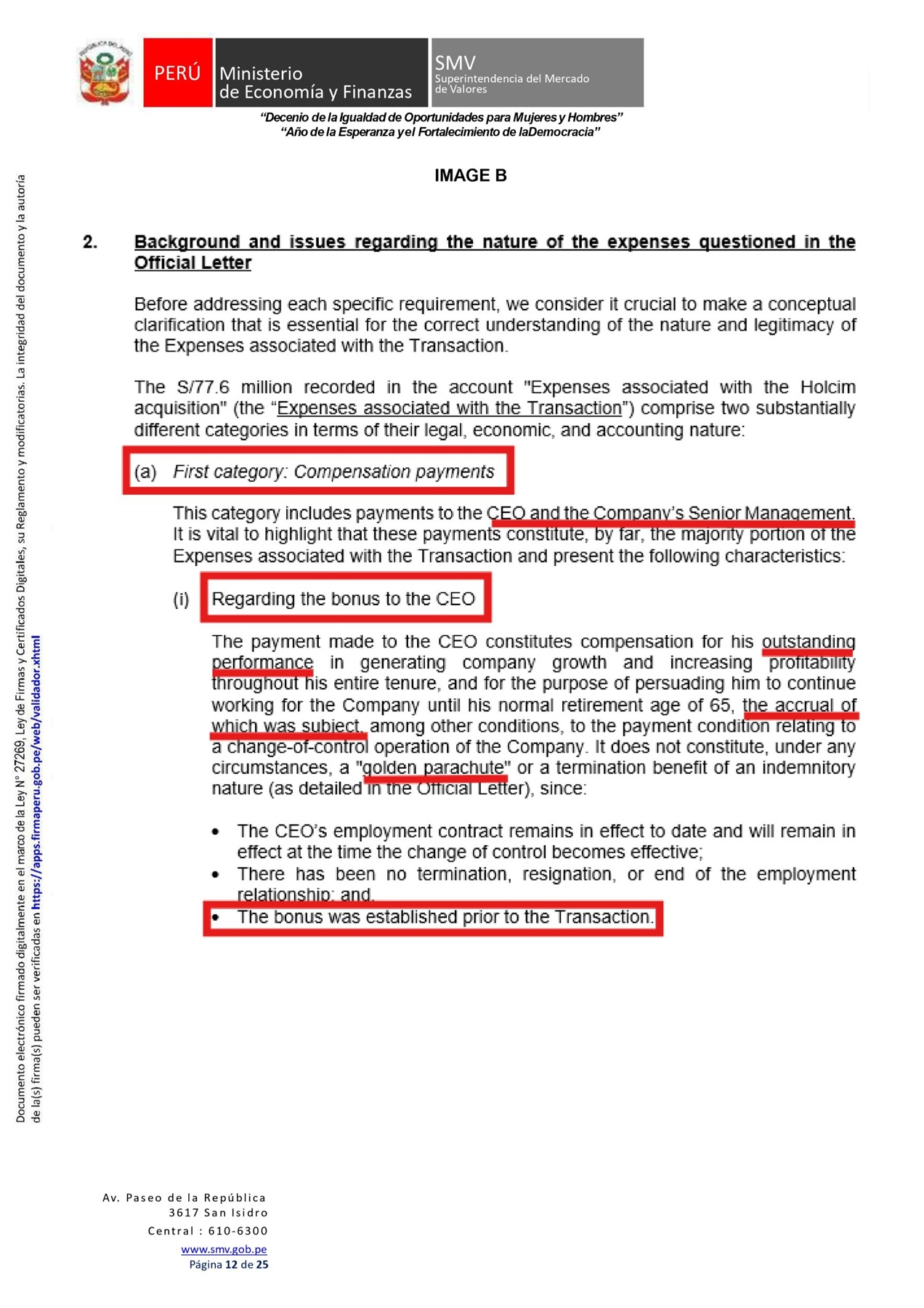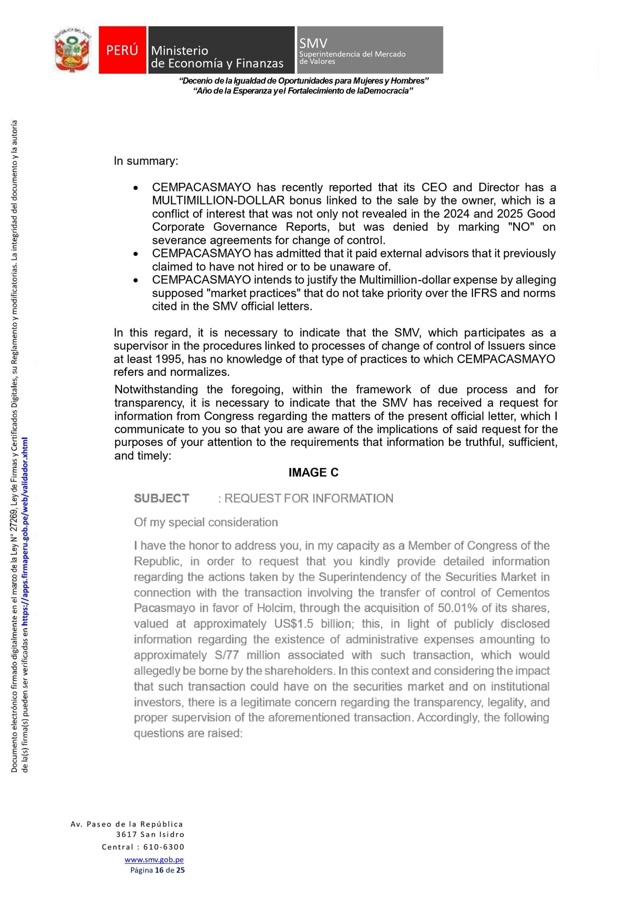 PERÚ Ministerio de Economía y Finanzas Av. Pa s eo de la Re pú bl i ca 3 617 S a n I s i dr o C entr a l : 610 - 630 0 www.smv.gob.pe Página 16 de 25 SMV Superintendencia del Mercado de Valores “Decenio de la Igualdad de Oportunidades para Mujeresy Hombres” “Año de la Esperanza yel Fortalecimiento de laDemocracia” In summary : CEMPACASMAYO has recently reported that its CEO and Director has a MULTIMILLION - DOLLAR bonus linked to the sale by the owner, which is a conflict of interest that was not only not revealed in the 2024 and 2025 Good Corporate Governance Reports, but was denied by marking "NO" on severance agreements for change of control . CEMPACASMAYO has admitted that it paid external advisors that it previously claimed to have not hired or to be unaware of . CEMPACASMAYO intends to justify the Multimillion - dollar expense by alleging supposed "market practices" that do not take priority over the IFRS and norms cited in the SMV official letters . In this regard, it is necessary to indicate that the SMV, which participates as a supervisor in the procedures linked to processes of change of control of Issuers since at least 1995 , has no knowledge of that type of practices to which CEMPACASMAYO refers and normalizes . Notwithstanding the foregoing, within the framework of due process and for transparency, it is necessary to indicate that the SMV has received a request for information from Congress regarding the matters of the present official letter, which I communicate to you so that you are aware of the implications of said request for the purposes of your attention to the requirements that information be truthful, sufficient, and timely : IMAGE C