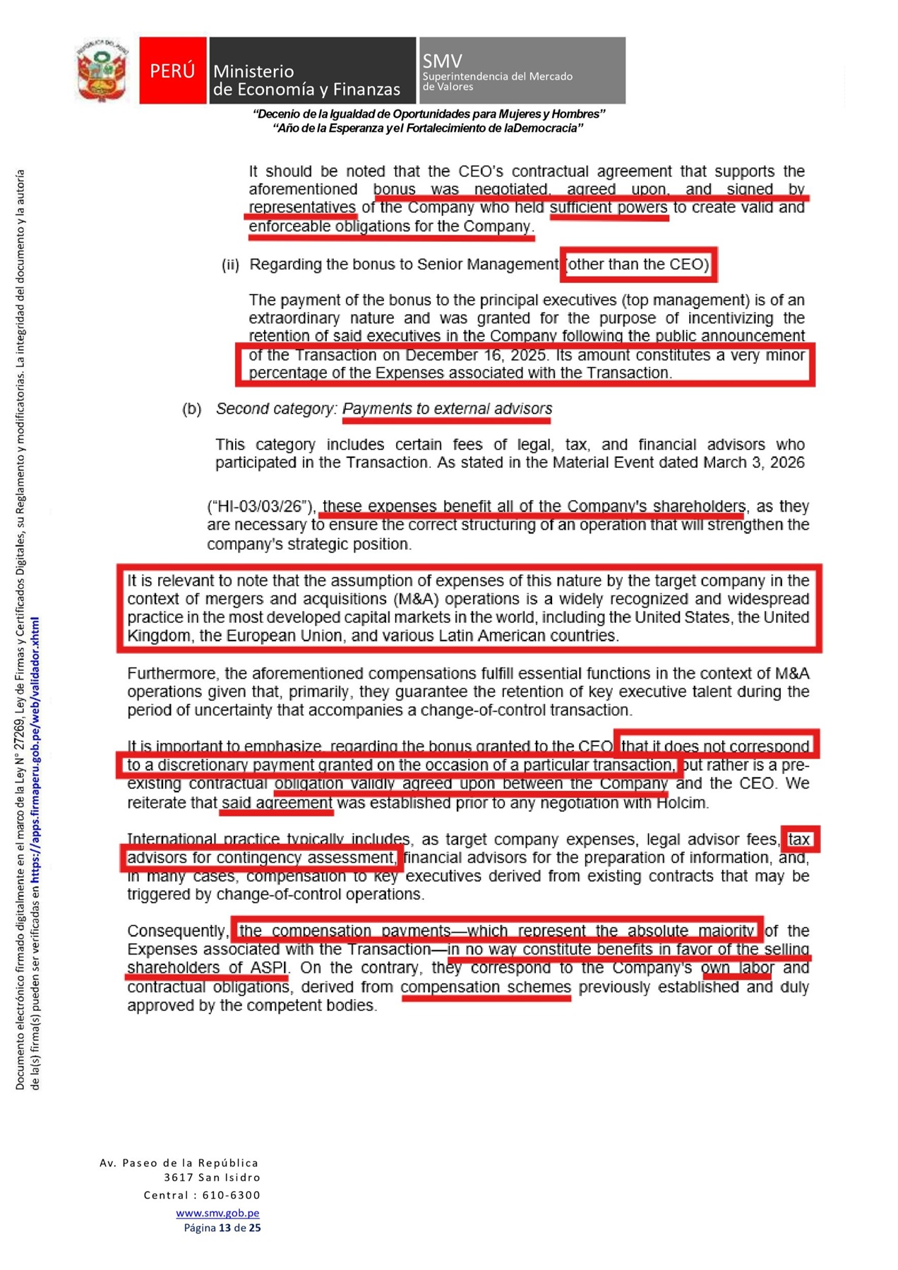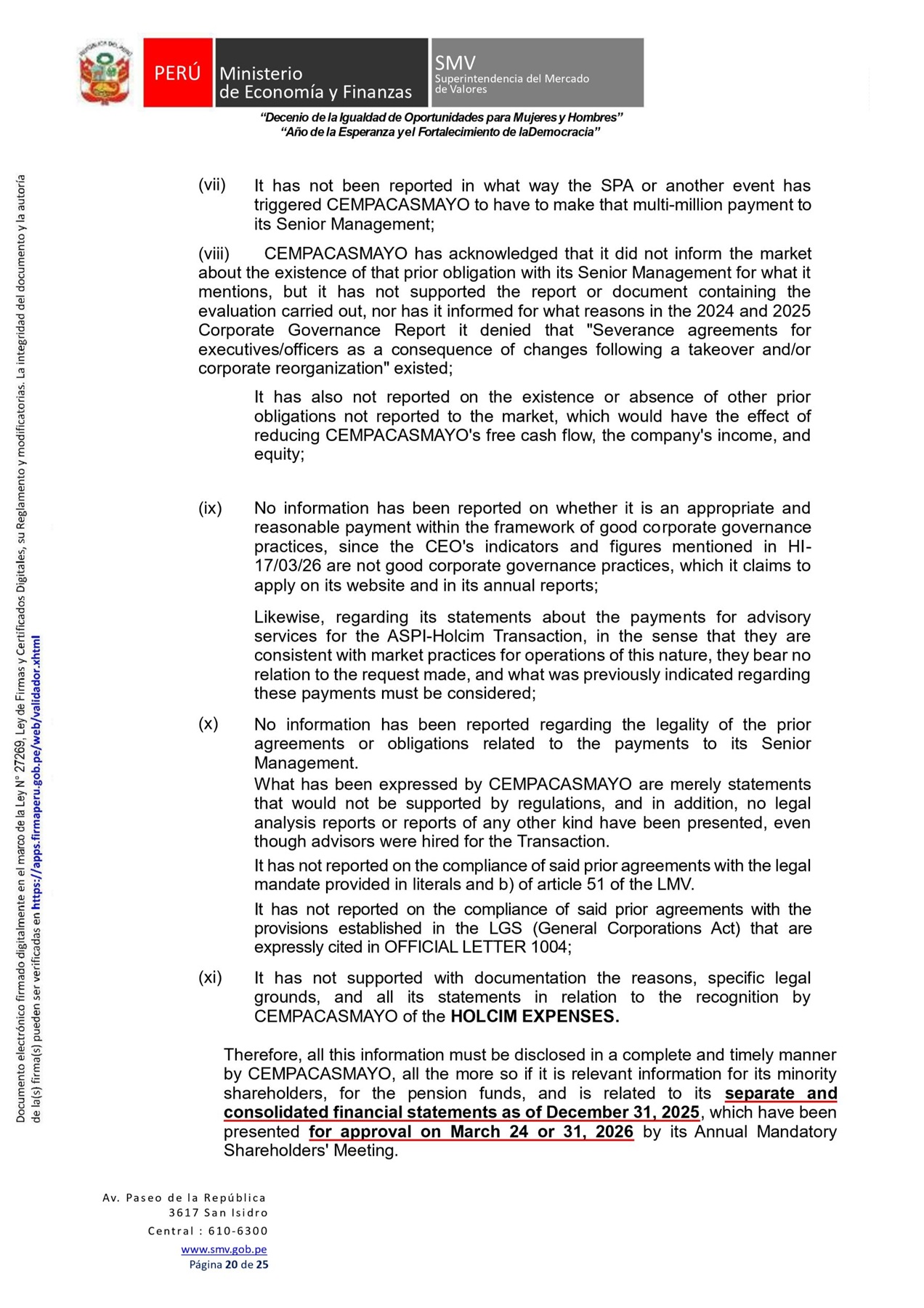PERÚ Ministerio de Economía y Finanzas Av. Pa s eo de la Re pú bl i ca 3 617 S a n I s i dr o C entr a l : 610 - 630 0 www.smv.gob.pe Página 20 de 25 SMV Superintendencia del Mercado de Valores “Decenio de la Igualdad de Oportunidades para Mujeresy Hombres” “Año de la Esperanza yel Fortalecimiento de laDemocracia” (vii) (viii) It has not been reported in what way the SPA or another event has triggered CEMPACASMAYO to have to make that multi - million payment to its Senior Management ; CEMPACASMAYO has acknowledged that it did not inform the market about the existence of that prior obligation with its Senior Management for what it mentions, but it has not supported the report or document containing the evaluation carried out, nor has it informed for what reasons in the 2024 and 2025 Corporate Governance Report it denied that "Severance agreements for executives/officers as a consequence of changes following a takeover and/or corporate reorganization" existed ; It has also not reported on the existence or absence of other prior obligations not reported to the market, which would have the effect of reducing CEMPACASMAYO's free cash flow, the company's income, and equity ; (ix) No information has been reported on whether it is an appropriate and reasonable payment within the framework of good corporate governance practices, since the CEO's indicators and figures mentioned in HI - 17 / 03 / 26 are not good corporate governance practices, which it claims to apply on its website and in its annual reports ; Likewise, regarding its statements about the payments for advisory services for the ASPI - Holcim Transaction, in the sense that they are consistent with market practices for operations of this nature, they bear no relation to the request made, and what was previously indicated regarding these payments must be considered ; No information has been reported regarding the legality of the prior agreements or obligations related to the payments to its Senior Management . What has been expressed by CEMPACASMAYO are merely statements that would not be supported by regulations, and in addition, no legal analysis reports or reports of any other kind have been presented, even though advisors were hired for the Transaction . It has not reported on the compliance of said prior agreements with the legal mandate provided in literals and b) of article 51 of the LMV . It has not reported on the compliance of said prior agreements with the provisions established in the LGS (General Corporations Act) that are expressly cited in OFFICIAL LETTER 1004 ; It has not supported with documentation the reasons, specific legal grounds, and all its statements in relation to the recognition by CEMPACASMAYO of the HOLCIM EXPENSES . (x) (xi) Therefore, all this information must be disclosed in a complete and timely manner by CEMPACASMAYO, all the more so if it is relevant information for its minority shareholders, for the pension funds, and is related to its separate and consolidated financial statements as of December 31 , 2025 , which have been presented for approval on March 24 or 31 , 2026 by its Annual Mandatory Shareholders' Meeting .