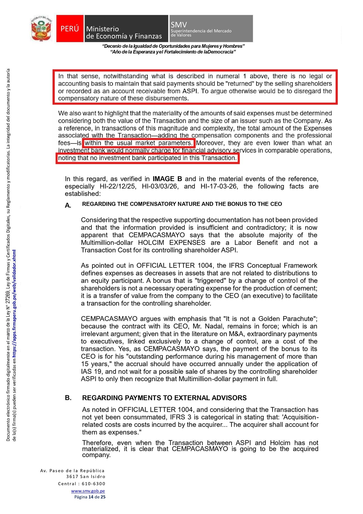 PERÚ Ministerio de Economía y Finanzas Av. Pa s eo de la Re pú bl i ca 3 617 S a n I s i dr o C entr a l : 610 - 630 0 www.smv.gob.pe Página 14 de 25 SMV Superintendencia del Mercado de Valores “Decenio de la Igualdad de Oportunidades para Mujeresy Hombres” “Año de la Esperanza yel Fortalecimiento de laDemocracia” In this regard, as verified in IMAGE B and in the material events of the reference, especially HI - 22 / 12 / 25 , HI - 03 / 03 / 26 , and HI - 17 - 03 - 26 , the following facts are established : A. REGARDING THE COMPENSATORY NATURE AND THE BONUS TO THE CEO Considering that the respective supporting documentation has not been provided and that the information provided is insufficient and contradictory ; it is now apparent that CEMPACASMAYO says that the absolute majority of the Multimillion - dollar HOLCIM EXPENSES are a Labor Benefit and not a Transaction Cost for its controlling shareholder ASPI . As pointed out in OFFICIAL LETTER 1004 , the IFRS Conceptual Framework defines expenses as decreases in assets that are not related to distributions to an equity participant . A bonus that is "triggered" by a change of control of the shareholders is not a necessary operating expense for the production of cement ; it is a transfer of value from the company to the CEO (an executive) to facilitate a transaction for the controlling shareholder . CEMPACASMAYO argues with emphasis that "It is not a Golden Parachute" ; because the contract with its CEO, Mr . Nadal, remains in force ; which is an irrelevant argument ; given that in the literature on M&A, extraordinary payments to executives, linked exclusively to a change of control, are a cost of the transaction . Yes, as CEMPACASMAYO says, the payment of the bonus to its CEO is for his "outstanding performance during his management of more than 15 years," the accrual should have occurred annually under the application of IAS 19 , and not wait for a possible sale of shares by the controlling shareholder ASPI to only then recognize that Multimillion - dollar payment in full . B. REGARDING PAYMENTS TO EXTERNAL ADVISORS As noted in OFFICIAL LETTER 1004 , and considering that the Transaction has not yet been consummated, IFRS 3 is categorical in stating that : 'Acquisition - related costs are costs incurred by the acquirer ... The acquirer shall account for them as expenses . " Therefore, even when the Transaction between ASPI and Holcim has not materialized, it is clear that CEMPACASMAYO is going to be the acquired company .
