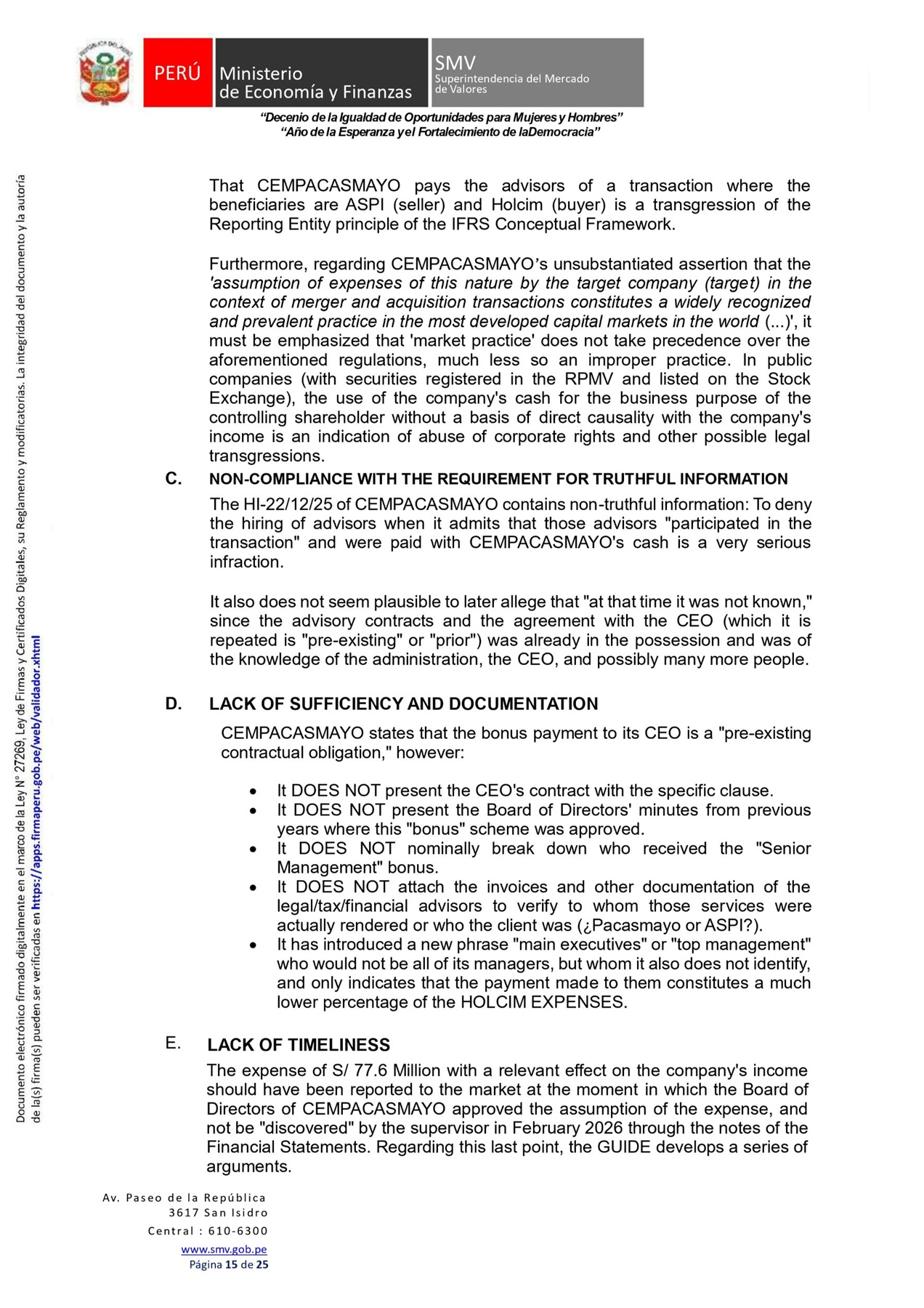 PERÚ Av. Pa s eo de la Re pú bl i ca 3 617 S a n I s i dr o C entr a l : 610 - 630 0 www.smv.gob.pe Página 15 de 25 Ministerio de Economía y Finanzas SMV Superintendencia del Mercado de Valores “Decenio de la Igualdad de Oportunidades para Mujeresy Hombres” “Año de la Esperanza yel Fortalecimiento de laDemocracia” That CEMPACASMAYO pays the advisors of a transaction where the beneficiaries are ASPI (seller) and Holcim (buyer) is a transgression of the Reporting Entity principle of the IFRS Conceptual Framework . Furthermore, regarding CEMPACASMAYO ’ s unsubstantiated assertion that the 'assumption of expenses of this nature by the target company (target) in the context of merger and acquisition transactions constitutes a widely recognized and prevalent practice in the most developed capital markets in the world ( ... )', it must be emphasized that 'market practice' does not take precedence over the aforementioned regulations, much less so an improper practice . In public companies (with securities registered in the RPMV and listed on the Stock Exchange), the use of the company's cash for the business purpose of the controlling shareholder without a basis of direct causality with the company's income is an indication of abuse of corporate rights and other possible legal transgressions . C. NON - COMPLIANCE WITH THE REQUIREMENT FOR TRUTHFUL INFORMATION The HI - 22 / 12 / 25 of CEMPACASMAYO contains non - truthful information : To deny the hiring of advisors when it admits that those advisors "participated in the transaction" and were paid with CEMPACASMAYO's cash is a very serious infraction . It also does not seem plausible to later allege that "at that time it was not known," since the advisory contracts and the agreement with the CEO (which it is repeated is "pre - existing" or "prior") was already in the possession and was of the knowledge of the administration, the CEO, and possibly many more people . D. LACK OF SUFFICIENCY AND DOCUMENTATION CEMPACASMAYO states that the bonus payment to its CEO is a "pre - existing contractual obligation," however: It DOES NOT present the CEO's contract with the specific clause . It DOES NOT present the Board of Directors' minutes from previous years where this "bonus" scheme was approved . It DOES NOT nominally break down who received the "Senior Management" bonus . It DOES NOT attach the invoices and other documentation of the legal/tax/financial advisors to verify to whom those services were actually rendered or who the client was ( ¿ Pacasmayo or ASPI?) . It has introduced a new phrase "main executives" or "top management" who would not be all of its managers, but whom it also does not identify, and only indicates that the payment made to them constitutes a much lower percentage of the HOLCIM EXPENSES . E. LACK OF TIMELINESS The expense of S/ 77 . 6 Million with a relevant effect on the company's income should have been reported to the market at the moment in which the Board of Directors of CEMPACASMAYO approved the assumption of the expense, and not be "discovered" by the supervisor in February 2026 through the notes of the Financial Statements . Regarding this last point, the GUIDE develops a series of arguments .