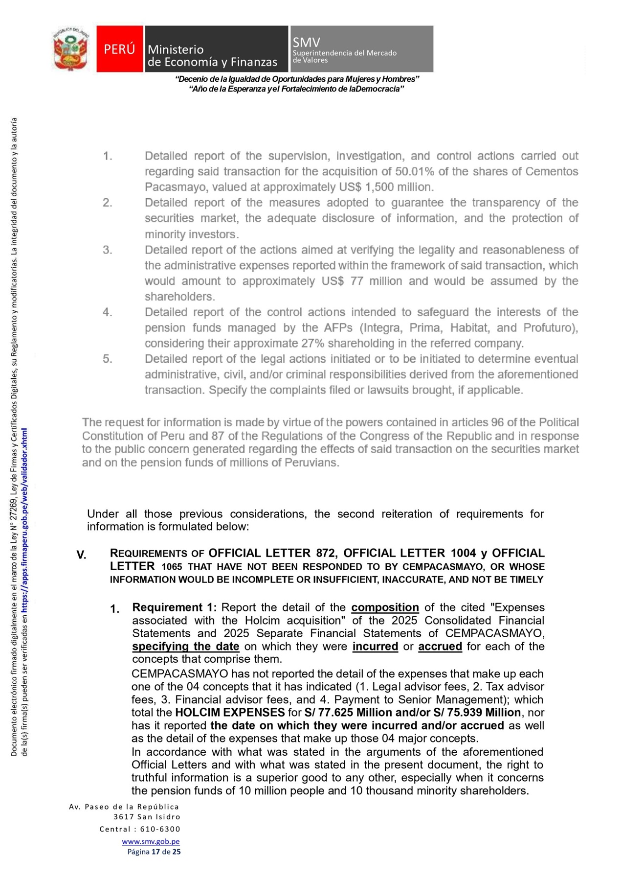 PERÚ Av. Pa s eo de la Re pú bl i ca 3 617 S a n I s i dr o C entr a l : 610 - 630 0 www.smv.gob.pe Página 17 de 25 Ministerio de Economía y Finanzas SMV Superintendencia del Mercado de Valores “Decenio de la Igualdad de Oportunidades para Mujeresy Hombres” “Año de la Esperanza yel Fortalecimiento de laDemocracia” Under all those previous considerations, the second reiteration of requirements for information is formulated below: V. R EQUIREMENTS OF OFFICIAL LETTER 872 , OFFICIAL LETTER 1004 y OFFICIAL LETTER 1065 THAT HAVE NOT BEEN RESPONDED TO BY CEMPACASMAYO, OR WHOSE INFORMATION WOULD BE INCOMPLETE OR INSUFFICIENT, INACCURATE, AND NOT BE TIMELY 1. Requirement 1 : Report the detail of the composition of the cited "Expenses associated with the Holcim acquisition" of the 2025 Consolidated Financial Statements and 2025 Separate Financial Statements of CEMPACASMAYO, specifying the date on which they were incurred or accrued for each of the concepts that comprise them . CEMPACASMAYO has not reported the detail of the expenses that make up each one of the 04 concepts that it has indicated ( 1 . Legal advisor fees, 2 . Tax advisor fees, 3 . Financial advisor fees, and 4 . Payment to Senior Management) ; which total the HOLCIM EXPENSES for S/ 77 . 625 Million and/or S/ 75 . 939 Million , nor has it reported the date on which they were incurred and/or accrued as well as the detail of the expenses that make up those 04 major concepts . In accordance with what was stated in the arguments of the aforementioned Official Letters and with what was stated in the present document, the right to truthful information is a superior good to any other, especially when it concerns the pension funds of 10 million people and 10 thousand minority shareholders .
