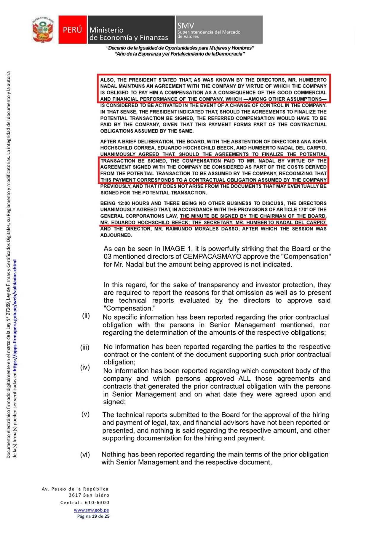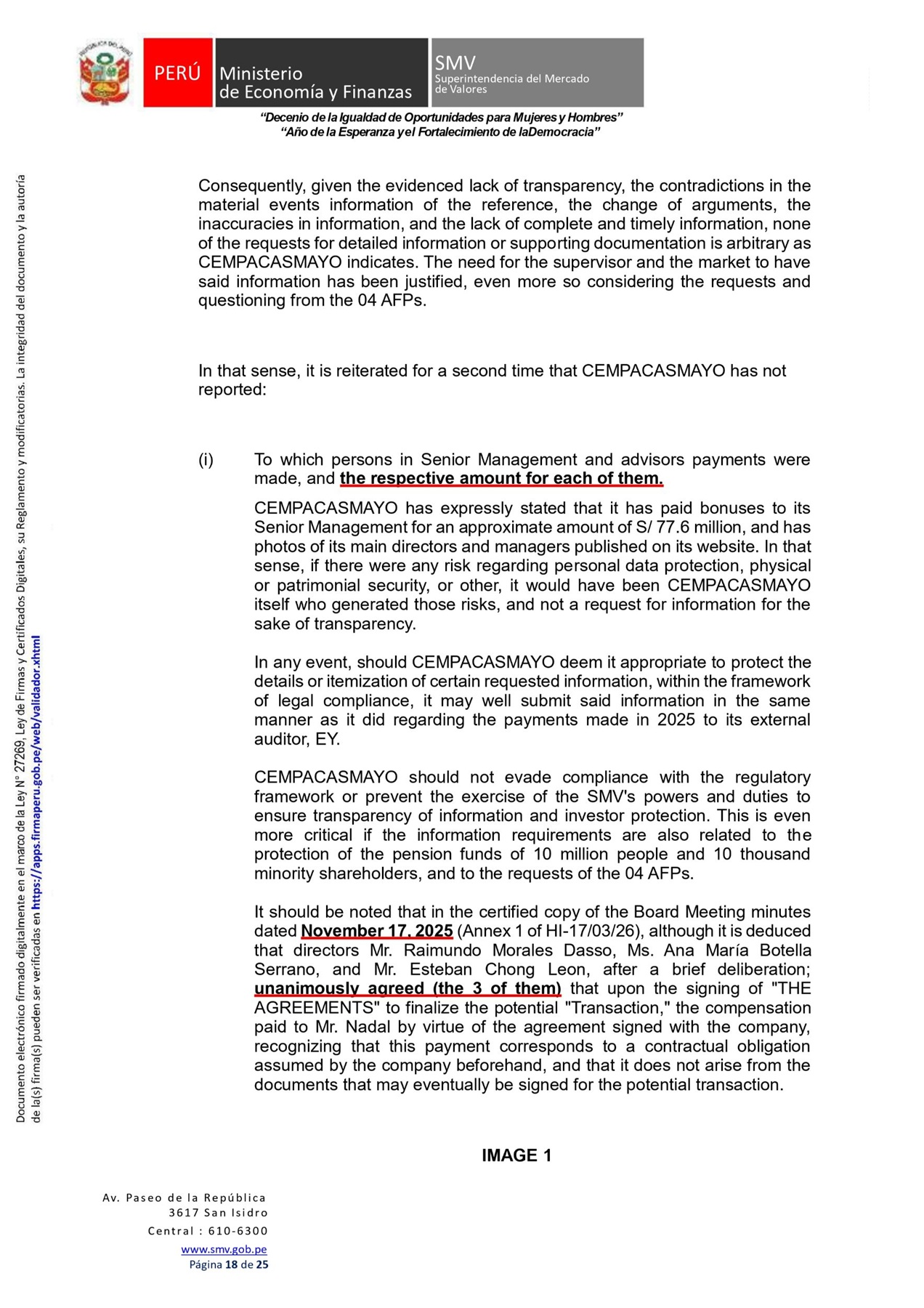 PERÚ Ministerio de Economía y Finanzas Av. Pa s eo de la Re pú bl i ca 3 617 S a n I s i dr o C entr a l : 610 - 630 0 www.smv.gob.pe Página 18 de 25 SMV Superintendencia del Mercado de Valores “Decenio de la Igualdad de Oportunidades para Mujeresy Hombres” “Año de la Esperanza yel Fortalecimiento de laDemocracia” Consequently, given the evidenced lack of transparency, the contradictions in the material events information of the reference, the change of arguments, the inaccuracies in information, and the lack of complete and timely information, none of the requests for detailed information or supporting documentation is arbitrary as CEMPACASMAYO indicates . The need for the supervisor and the market to have said information has been justified, even more so considering the requests and questioning from the 04 AFPs . In that sense, it is reiterated for a second time that CEMPACASMAYO has not reported: (i) To which persons in Senior Management and advisors payments were made, and the respective amount for each of them . CEMPACASMAYO has expressly stated that it has paid bonuses to its Senior Management for an approximate amount of S/ 77 . 6 million, and has photos of its main directors and managers published on its website . In that sense, if there were any risk regarding personal data protection, physical or patrimonial security, or other, it would have been CEMPACASMAYO itself who generated those risks, and not a request for information for the sake of transparency . In any event, should CEMPACASMAYO deem it appropriate to protect the details or itemization of certain requested information, within the framework of legal compliance, it may well submit said information in the same manner as it did regarding the payments made in 2025 to its external auditor, EY . CEMPACASMAYO should not evade compliance with the regulatory framework or prevent the exercise of the SMV's powers and duties to ensure transparency of information and investor protection . This is even more critical if the information requirements are also related to the protection of the pension funds of 10 million people and 10 thousand minority shareholders, and to the requests of the 04 AFPs . It should b e noted that in the certified c op y of the Board Meeting minutes dated November 17 , 2 0 2 5 (Annex 1 of HI - 17 / 03 / 26 ), although it is d e d u c e d that directors Mr . Raimundo Morales Dasso, Ms . Ana Mar í a Botella Serrano, a n d Mr . Esteban Chong Leon, after a brief deliberation ; unanimously agreed (the 3 of them) that u p o n the signing of "THE AGREEMENTS" to finalize the potential "Transaction," the compensation paid to Mr . Nadal b y virtue of the agreement signed with the company, recognizing that this payment corresponds to a contractual obligation a ss u m e d b y the c o m p a n y beforehand, a n d that it d o e s not arise from the documents that m a y eventually b e signed for the potential transaction . IMAGE 1