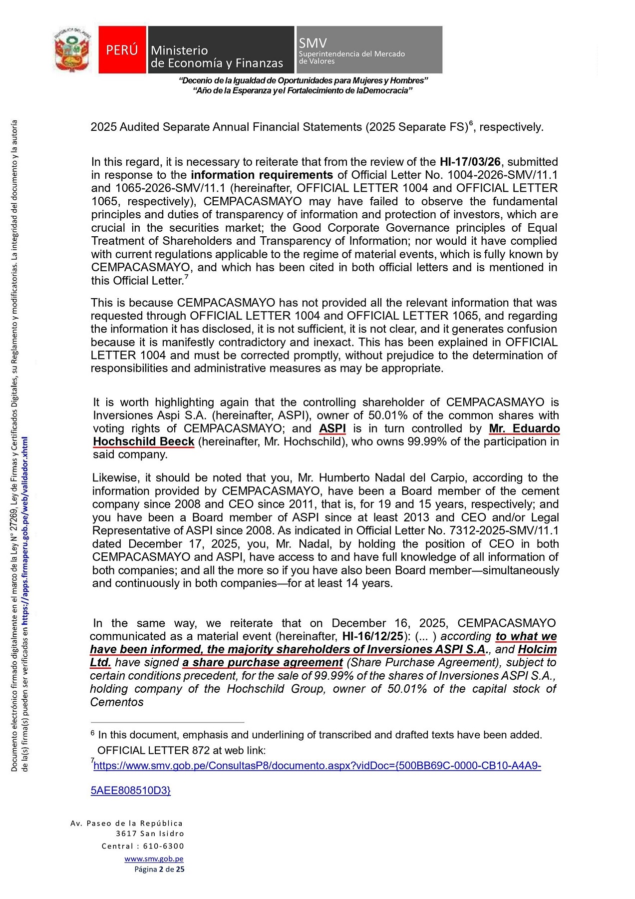 PERÚ Ministerio de Economía y Finanzas SMV Superintendencia del Mercado de Valores “Decenio de la Igualdad de Oportunidades para Mujeresy Hombres” “Año de la Esperanza yel Fortalecimiento de laDemocracia” 2025 Audited Separate Annual Financial Statements (2025 Separate FS) ⁶ , respectively. In this regard, it is necessary to reiterate that from the review of the HI - 17 / 03 / 26 , submitted in response to the information requirements of Official Letter No . 1004 - 2026 - SMV/ 11 . 1 and 1065 - 2026 - SMV/ 11 . 1 (hereinafter, OFFICIAL LETTER 1004 and OFFICIAL LETTER 1065, respectively), CEMPACASMAYO may have failed to observe the fundamental principles and duties of transparency of information and protection of investors, which are crucial in the securities market; the Good Corporate Governance principles of Equal Treatment of Shareholders and Transparency of Information; nor would it have complied with current regulations applicable to the regime of material events, which is fully known by CEMPACASMAYO, and which has been cited in both official letters and is mentioned in this Official Letter. ⁷ This is because CEMPACASMAYO has not provided all the relevant information that was requested through OFFICIAL LETTER 1004 and OFFICIAL LETTER 1065 , and regarding the information it has disclosed, it is not sufficient, it is not clear, and it generates confusion because it is manifestly contradictory and inexact . This has been explained in OFFICIAL LETTER 1004 and must be corrected promptly, without prejudice to the determination of responsibilities and administrative measures as may be appropriate . It is worth highlighting again that the controlling shareholder of CEMPACASMAYO is Inversiones Aspi S . A . (hereinafter, ASPI), owner of 50 . 01 % of the common shares with voting rights of CEMPACASMAYO ; and ASPI is in turn controlled by Mr . Eduardo Hochschild Beeck (hereinafter, Mr . Hochschild), who owns 99 . 99 % of the participation in said company . Likewise, it should be noted that you, Mr . Humberto Nadal del Carpio, according to the information provided by CEMPACASMAYO, have been a Board member of the cement company since 2008 and CEO since 2011 , that is, for 19 and 15 years, respectively ; and you have been a Board member of ASPI since at least 2013 and CEO and/or Legal Representative of ASPI since 2008 . As indicated in Official Letter No . 7312 - 2025 - SMV/ 11 . 1 dated December 17 , 2025 , you, Mr . Nadal, by holding the position of CEO in both CEMPACASMAYO and ASPI, have access to and have full knowledge of all information of both companies ; and all the more so if you have also been Board member — simultaneously and continuously in both companies — for at least 14 years . In the same way, we reiterate that on December 16 , 2025 , CEMPACASMAYO communicated as a material event (hereinafter, HI - 16 / 12 / 25 ) : ( ... ) according to what we have been informed, the majority shareholders of Inversiones ASPI S . A . , and Holcim Ltd . have signed a share purchase agreement (Share Purchase Agreement), subject to certain conditions precedent, for the sale of 99 . 99 % of the shares of Inversiones ASPI S . A . , holding company of the Hochschild Group, owner of 50 . 01 % of the capital stock of Cementos 6 In this document, emphasis and underlining of transcribed and drafted texts have been added. OFFICIAL LETTER 872 at web link: 7 https://www.smv.gob.pe/ConsultasP8/documento.aspx?vidDoc={500BB69C - 0000 - CB10 - A4A9 - 5AEE808510D3} Av. Pa s eo de la Re pú bl i ca 3 617 S a n I s i dr o C entr a l : 610 - 630 0 www.smv.gob.pe Página 2 de 25