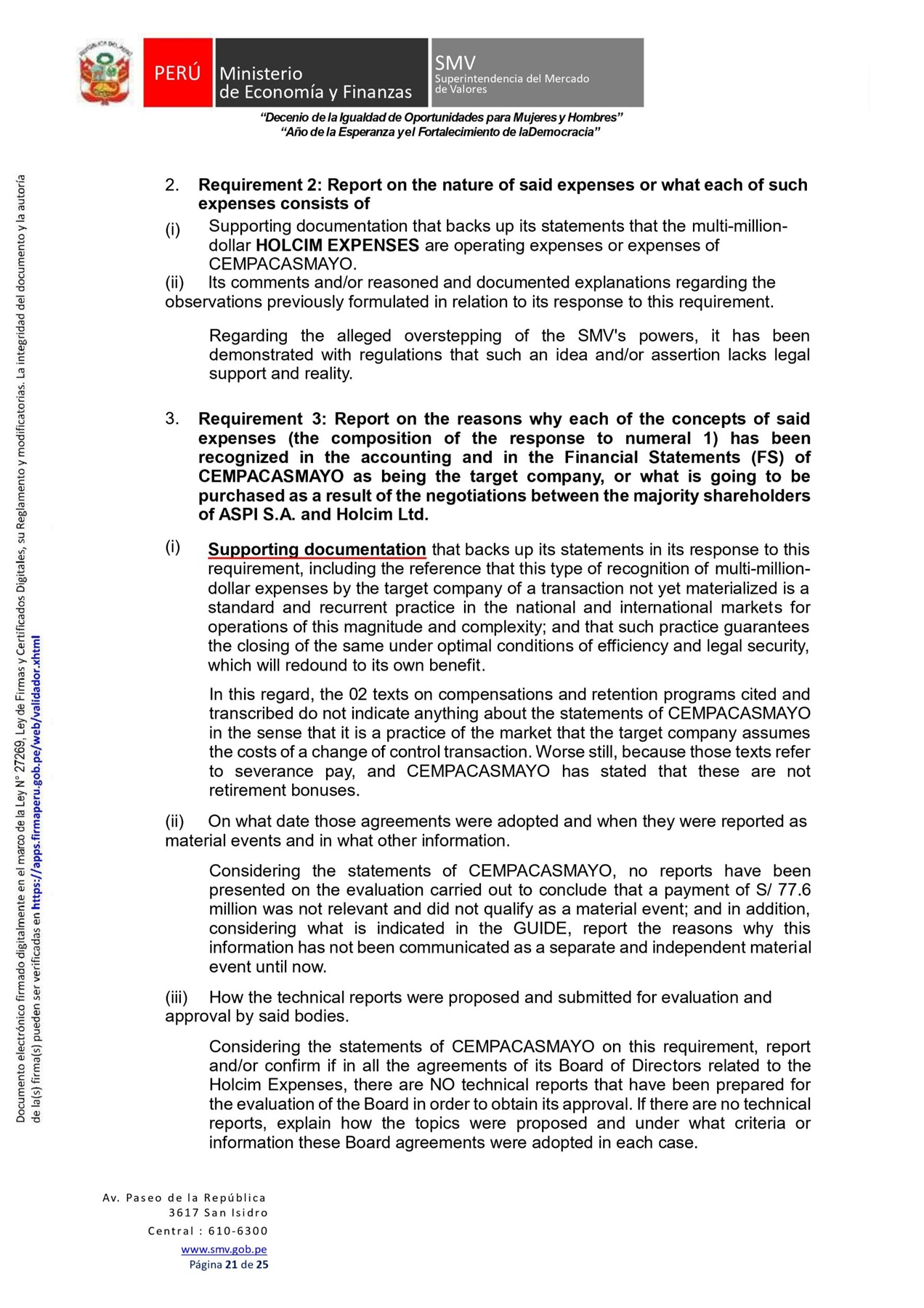 PERÚ Ministerio de Economía y Finanzas Av. Pa s eo de la Re pú bl i ca 3 617 S a n I s i dr o C entr a l : 610 - 630 0 www.smv.gob.pe Página 21 de 25 SMV Superintendencia del Mercado de Valores “Decenio de la Igualdad de Oportunidades para Mujeresy Hombres” “Año de la Esperanza yel Fortalecimiento de laDemocracia” 2. Requirement 2: Report on the nature of said expenses or what each of such expenses consists of (i) (ii) Supporting documentation that backs up its statements that the multi - million - dollar HOLCIM EXPENSES are operating expenses or expenses of CEMPACASMAYO. Its comments and/or reasoned and documented explanations regarding the observations previously formulated in relation to its response to this requirement. Regarding the alleged overstepping of the SMV's powers, it has been demonstrated with regulations that such an idea and/or assertion lacks legal support and reality . (i) (ii) 3 . Requirement 3 : Report on the reasons why each of the concepts of said expenses (the composition of the response to numeral 1 ) has been recognized in the accounting and in the Financial Statements (FS) of CEMPACASMAYO as being the target company, or what is going to be purchased as a result of the negotiations between the majority shareholders of ASPI S . A . and Holcim Ltd . Supporting documentation that backs up its statements in its response to this requirement, including the reference that this type of recognition of multi - million - dollar expenses by the target company of a transaction not yet materialized is a standard and recurrent practice in the national and international markets for operations of this magnitude and complexity ; and that such practice guarantees the closing of the same under optimal conditions of efficiency and legal security, which will redound to its own benefit . In this regard, the 02 texts on compensations and retention programs cited and transcribed do not indicate anything about the statements of CEMPACASMAYO in the sense that it is a practice of the market that the target company assumes the costs of a change of control transaction . Worse still, because those texts refer to severance pay, and CEMPACASMAYO has stated that these are not retirement bonuses . On what date those agreements were adopted and when they were reported as material events and in what other information. Considering the statements of CEMPACASMAYO, no reports have been presented on the evaluation carried out to conclude that a payment of S/ 77 . 6 million was not relevant and did not qualify as a material event ; and in addition, considering what is indicated in the GUIDE, report the reasons why this information has not been communicated as a separate and independent material event until now . (iii) How the technical reports were proposed and submitted for evaluation and approval by said bodies. Considering the statements of CEMPACASMAYO on this requirement, report and/or confirm if in all the agreements of its Board of Directors related to the Holcim Expenses, there are NO technical reports that have been prepared for the evaluation of the Board in order to obtain its approval . If there are no technical reports, explain how the topics were proposed and under what criteria or information these Board agreements were adopted in each case .