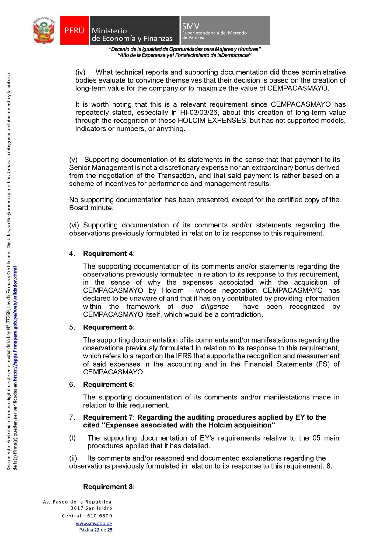 PERÚ Ministerio de Economía y Finanzas Av. Pa s eo de la Re pú bl i ca 3 617 S a n I s i dr o C entr a l : 610 - 630 0 www.smv.gob.pe Página 22 de 25 SMV Superintendencia del Mercado de Valores “Decenio de la Igualdad de Oportunidades para Mujeresy Hombres” “Año de la Esperanza yel Fortalecimiento de laDemocracia” (iv) What technical reports and supporting documentation did those administrative bodies evaluate to convince themselves that their decision is based on the creation of long - term value for the company or to maximize the value of CEMPACASMAYO . It is worth noting that this is a relevant requirement since CEMPACASMAYO has repeatedly stated, especially in HI - 03 / 03 / 26 , about this creation of long - term value through the recognition of these HOLCIM EXPENSES, but has not supported models, indicators or numbers, or anything . (v) Supporting documentation of its statements in the sense that that payment to its Senior Management is not a discretionary expense nor an extraordinary bonus derived from the negotiation of the Transaction, and that said payment is rather based on a scheme of incentives for performance and management results . No supporting documentation has been presented, except for the certified copy of the Board minute. (vi) Supporting documentation of its comments and/or statements regarding the observations previously formulated in relation to its response to this requirement . 4 . Requirement 4 : The supporting documentation of its comments and/or statements regarding the observations previously formulated in relation to its response to this requirement, in the sense of why the expenses associated with the acquisition of CEMPACASMAYO by Holcim — whose negotiation CEMPACASMAYO has declared to be unaware of and that it has only contributed by providing information within the framework of due diligence — have been recognized by CEMPACASMAYO itself, which would be a contradiction. 5. Requirement 5: The supporting documentation of its comments and/or manifestations regarding the observations previously formulated in relation to its response to this requirement, which refers to a report on the IFRS that supports the recognition and measurement of said expenses in the accounting and in the Financial Statements (FS) of CEMPACASMAYO . 6. Requirement 6: The supporting documentation of its comments and/or manifestations made in relation to this requirement . 7. Requirement 7: Regarding the auditing procedures applied by EY to the cited "Expenses associated with the Holcim acquisition" (i) The supporting documentation of EY's requirements relative to the 05 main procedures applied that it has detailed. (ii) Its comments and/or reasoned and documented explanations regarding the observations previously formulated in relation to its response to this requirement. 8. Requirement 8 :