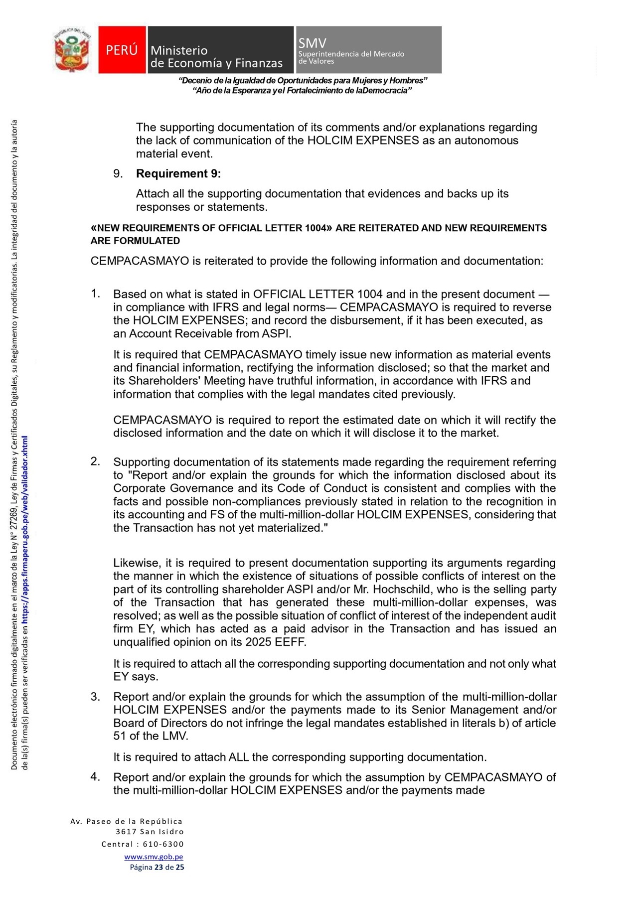 PERÚ Ministerio de Economía y Finanzas Av. Pa s eo de la Re pú bl i ca 3 617 S a n I s i dr o C entr a l : 610 - 630 0 www.smv.gob.pe Página 23 de 25 SMV Superintendencia del Mercado de Valores “Decenio de la Igualdad de Oportunidades para Mujeresy Hombres” “Año de la Esperanza yel Fortalecimiento de laDemocracia” The supporting documentation of its comments and/or explanations regarding the lack of communication of the HOLCIM EXPENSES as an autonomous material event. 9. Requirement 9: Attach all the supporting documentation that evidences and backs up its responses or statements. « NEW REQUIREMENTS OF OFFICIAL LETTER 1004 » ARE REITERATED AND NEW REQUIREMENTS ARE FORMULATED CEMPACASMAYO is reiterated to provide the following information and documentation: 1. Based on what is stated in OFFICIAL LETTER 1004 and in the present document — in compliance with IFRS and legal norms — CEMPACASMAYO is required to reverse the HOLCIM EXPENSES; and record the disbursement, if it has been executed, as an Account Receivable from ASPI. It is required that CEMPACASMAYO timely issue new information as material events and financial information, rectifying the information disclosed; so that the market and its Shareholders' Meeting have truthful information, in accordance with IFRS and information that complies with the legal mandates cited previously. CEMPACASMAYO is required to report the estimated date on which it will rectify the disclosed information and the date on which it will disclose it to the market. 2. Supporting documentation of its statements made regarding the requirement referring to "Report and/or explain the grounds for which the information disclosed about its Corporate Governance and its Code of Conduct is consistent and complies with the facts and possible non - compliances previously stated in relation to the recognition in its accounting and FS of the multi - million - dollar HOLCIM EXPENSES, considering that the Transaction has not yet materialized . " Likewise, it is required to present documentation supporting its arguments regarding the manner in which the existence of situations of possible conflicts of interest on the part of its controlling shareholder ASPI and/or Mr . Hochschild, who is the selling party of the Transaction that has generated these multi - million - dollar expenses, was resolved ; as well as the possible situation of conflict of interest of the independent audit firm EY, which has acted as a paid advisor in the Transaction and has issued an unqualified opinion on its 2025 EEFF . It is required to attach all the corresponding supporting documentation and not only what EY says . 3. Report and/or explain the grounds for which the assumption of the multi - million - dollar HOLCIM EXPENSES and/or the payments made to its Senior Management and/or Board of Directors do not infringe the legal mandates established in literals b) of article 51 of the LMV . It is required to attach ALL the corresponding supporting documentation . 4. Report and/or explain the grounds for which the assumption by CEMPACASMAYO of the multi - million - dollar HOLCIM EXPENSES and/or the payments made