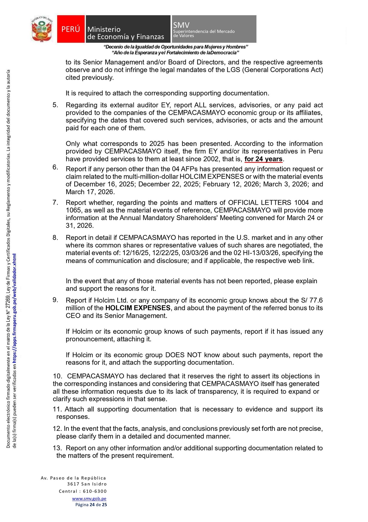 PERÚ Ministerio de Economía y Finanzas Av. Pa s eo de la Re pú bl i ca 3 617 S a n I s i dr o C entr a l : 610 - 630 0 www.smv.gob.pe Página 24 de 25 SMV Superintendencia del Mercado de Valores “Decenio de la Igualdad de Oportunidades para Mujeresy Hombres” “Año de la Esperanza yel Fortalecimiento de laDemocracia” to its Senior Management and/or Board of Directors, and the respective agreements observe and do not infringe the legal mandates of the LGS (General Corporations Act) cited previously . It is required to attach the corresponding supporting documentation . 5 . Regarding its external auditor EY, report ALL services, advisories, or any paid act provided to the companies of the CEMPACASMAYO economic group or its affiliates, specifying the dates that covered such services, advisories, or acts and the amount paid for each one of them . 6. 7. Only what corresponds to 2025 has been presented . According to the information provided by CEMPACASMAYO itself, the firm EY and/or its representatives in Peru have provided services to them at least since 2002 , that is, for 24 years . Report if any person other than the 04 AFPs has presented any information request or claim related to the multi - million - dollar HOLCIM EXPENSES or with the material events of December 16 , 2025 ; December 22 , 2025 ; February 12 , 2026 ; March 3 , 2026 ; and March 17 , 2026 . Report whether, regarding the points and matters of OFFICIAL LETTERS 1004 and 1065 , as well as the material events of reference, CEMPACASMAYO will provide more information at the Annual Mandatory Shareholders' Meeting convened for March 24 or 31 , 2026 . 8 . Report in detail if CEMPACASMAYO has reported in the U . S . market and in any other where its common shares or representative values of such shares are negotiated, the material events of : 12 / 16 / 25 , 12 / 22 / 25 , 03 / 03 / 26 and the 02 HI - 13 / 03 / 26 , specifying the means of communication and disclosure ; and if applicable, the respective web link . In the event that any of those material events has not been reported, please explain and support the reasons for it. Report if Holcim Ltd . or any company of its economic group knows about the S/ 77 . 6 million of the HOLCIM EXPENSES , and about the payment of the referred bonus to its CEO and its Senior Management . 9. If Holcim or its economic group knows of such payments, report if it has issued any pronouncement, attaching it. If Holcim or its economic group DOES NOT know about such payments, report the reasons for it, and attach the supporting documentation. 10. CEMPACASMAYO has declared that it reserves the right to assert its objections in the corresponding instances and considering that CEMPACASMAYO itself has generated all these information requests due to its lack of transparency, it is required to expand or clarify such expressions in that sense . 11. Attach all supporting documentation that is necessary to evidence and support its responses . 12. In the event that the facts, analysis, and conclusions previously set forth are not precise, please clarify them in a detailed and documented manner . 13. Report on any other information and/or additional supporting documentation related to the matters of the present requirement .
