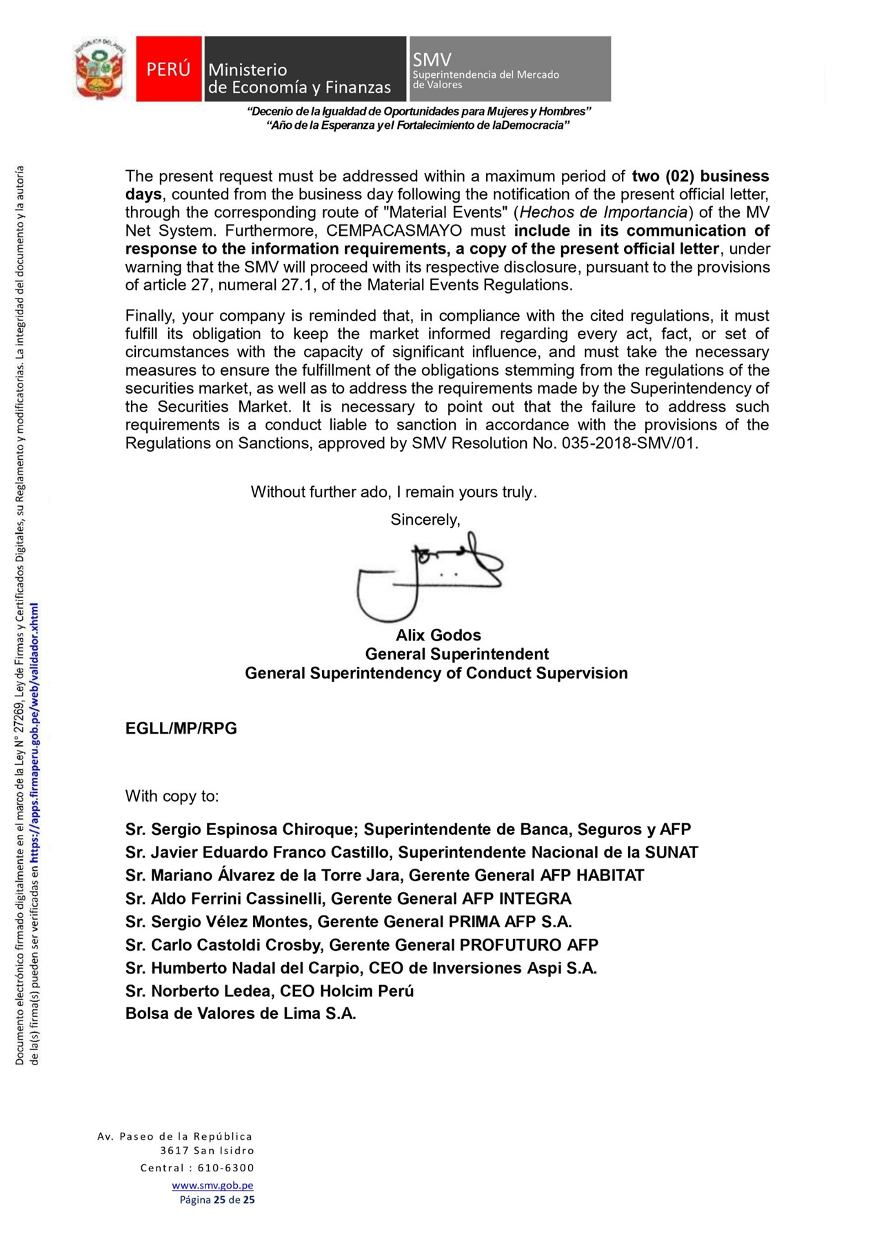 PERÚ Ministerio de Economía y Finanzas Av. Pa s eo de la Re pú bl i ca 3 617 S a n I s i dr o C entr a l : 610 - 630 0 www.smv.gob.pe Página 25 de 25 SMV Superintendencia del Mercado de Valores “Decenio de la Igualdad de Oportunidades para Mujeresy Hombres” “Año de la Esperanza yel Fortalecimiento de laDemocracia” The present request must be addressed within a maximum period of two ( 02 ) business days , counted from the business day following the notification of the present official letter, through the corresponding route of "Material Events" ( Hechos de Importancia ) of the MV Net System . Furthermore, CEMPACASMAYO must include in its communication of response to the information requirements, a copy of the present official letter , under warning that the SMV will proceed with its respective disclosure, pursuant to the provisions of article 27 , numeral 27 . 1 , of the Material Events Regulations . Finally, your company is reminded that, in compliance with the cited regulations, it must fulfill its obligation to keep the market informed regarding every act, fact, or set of circumstances with the capacity of significant influence, and must take the necessary measures to ensure the fulfillment of the obligations stemming from the regulations of the securities market, as well as to address the requirements made by the Superintendency of the Securities Market . It is necessary to point out that the failure to address such requirements is a conduct liable to sanction in accordance with the provisions of the Regulations on Sanctions, approved by SMV Resolution No . 035 - 2018 - SMV/ 01 . Without further ado, I remain yours truly. Sincerely, Alix Godos General Superintendent General Superintendency of Conduct Supervision EGLL/MP/RPG With copy to: Sr. Sergio Espinosa Chiroque; Superintendente de Banca, Seguros y AFP Sr. Javier Eduardo Franco Castillo, Superintendente Nacional de la SUNAT Sr. Mariano Álvarez de la Torre Jara, Gerente General AFP HABITAT Sr. Aldo Ferrini Cassinelli, Gerente General AFP INTEGRA Sr. Sergio Vélez Montes, Gerente General PRIMA AFP S.A. Sr . Carlo Castoldi Crosby, Gerente General PROFUTURO AFP Sr . Humberto Nadal del Carpio, CEO de Inversiones Aspi S . A . Sr . Norberto Ledea, CEO Holcim Perú Bolsa de Valores de Lima S . A .