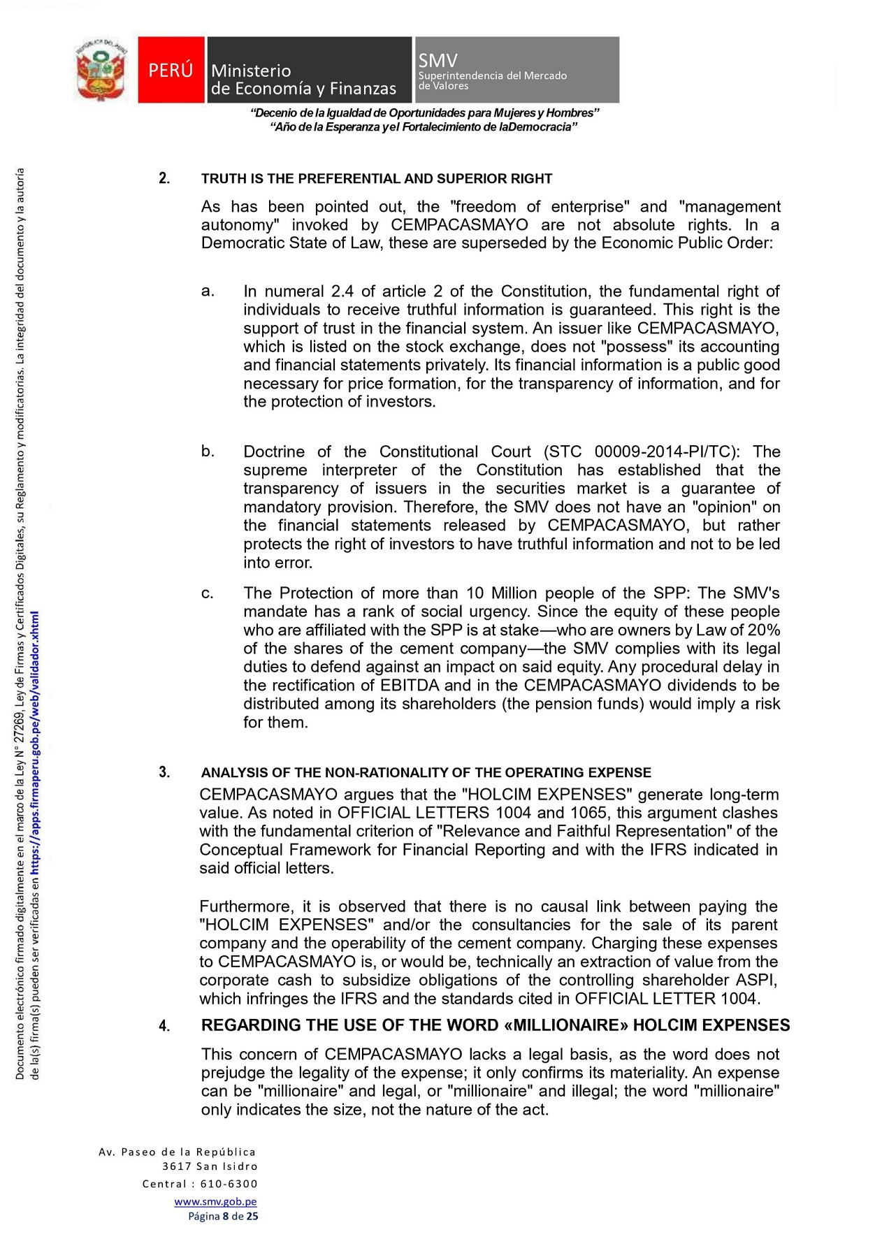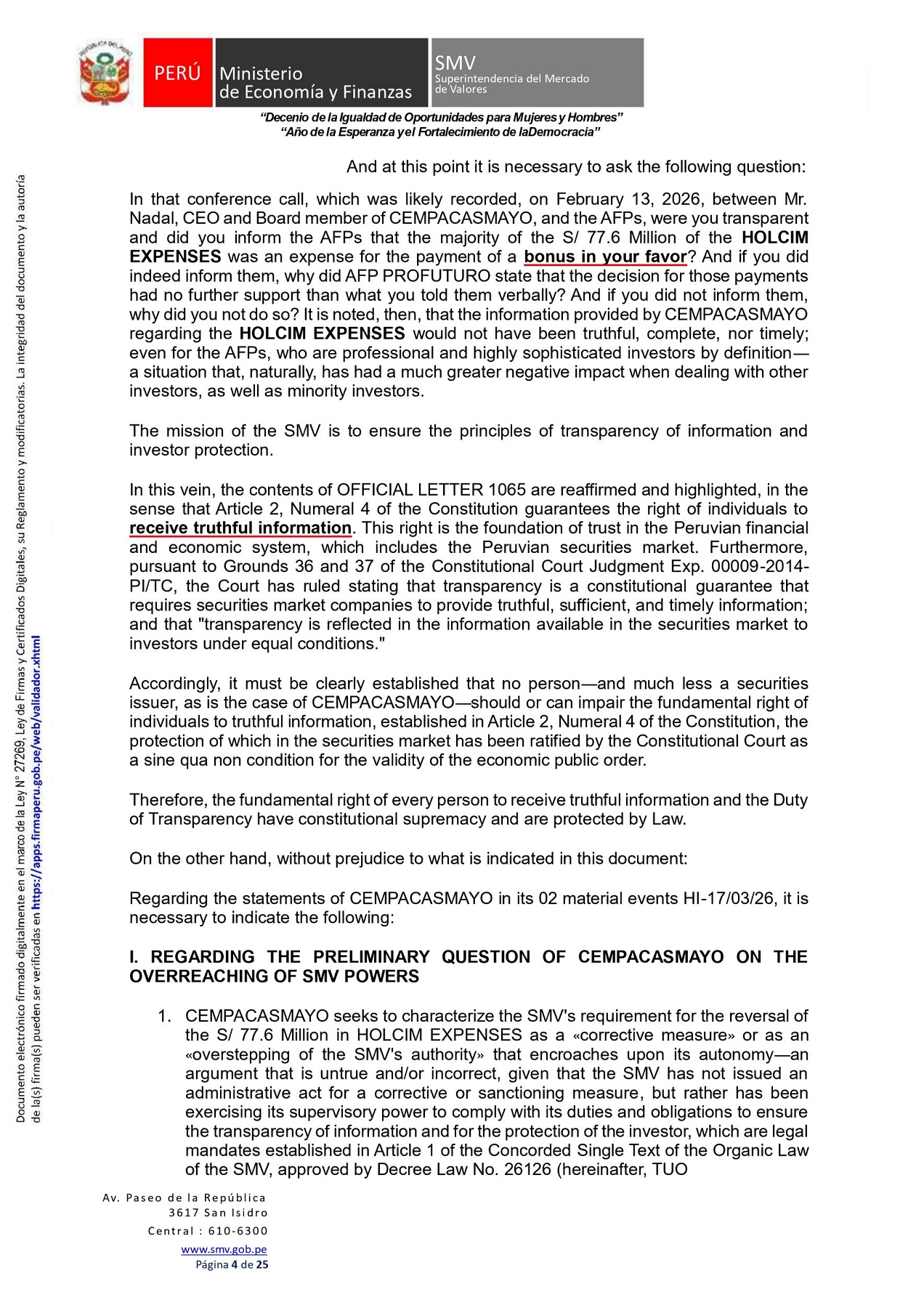 PERÚ Ministerio de Economía y Finanzas Av. Pa s eo de la Re pú bl i ca 3 617 S a n I s i dr o C entr a l : 610 - 630 0 www.smv.gob.pe Página 4 de 25 SMV Superintendencia del Mercado de Valores “Decenio de la Igualdad de Oportunidades para Mujeresy Hombres” “Año de la Esperanza yel Fortalecimiento de laDemocracia” And at this point it is necessary to ask the following question: In that conference call, which was likely recorded, on February 13 , 2026 , between Mr . Nadal, CEO and Board member of CEMPACASMAYO, and the AFPs, were you transparent and did you inform the AFPs that the majority of the S/ 77 . 6 Million of the HOLCIM EXPENSES was an expense for the payment of a bonus in your favor ? And if you did indeed inform them, why did AFP PROFUTURO state that the decision for those payments had no further support than what you told them verbally? And if you did not inform them, why did you not do so? It is noted, then, that the information provided by CEMPACASMAYO regarding the HOLCIM EXPENSES would not have been truthful, complete, nor timely ; even for the AFPs, who are professional and highly sophisticated investors by definition — a situation that, naturally, has had a much greater negative impact when dealing with other investors, as well as minority investors . The mission of the SMV is to ensure the principles of transparency of information and investor protection. In this vein, the contents of OFFICIAL LETTER 1065 are reaffirmed and highlighted, in the sense that Article 2 , Numeral 4 of the Constitution guarantees the right of individuals to receive truthful information . This right is the foundation of trust in the Peruvian financial and economic system, which includes the Peruvian securities market . Furthermore, pursuant to Grounds 36 and 37 of the Constitutional Court Judgment Exp . 00009 - 2014 - PI/TC, the Court has ruled stating that transparency is a constitutional guarantee that requires securities market companies to provide truthful, sufficient, and timely information ; and that "transparency is reflected in the information available in the securities market to investors under equal conditions . " Accordingly, it must be clearly established that no person — and much less a securities issuer, as is the case of CEMPACASMAYO — should or can impair the fundamental right of individuals to truthful information, established in Article 2 , Numeral 4 of the Constitution, the protection of which in the securities market has been ratified by the Constitutional Court as a sine qua non condition for the validity of the economic public order . Therefore, the fundamental right of every person to receive truthful information and the Duty of Transparency have constitutional supremacy and are protected by Law. On the other hand, without prejudice to what is indicated in this document: Regarding the statements of CEMPACASMAYO in its 02 material events HI - 17/03/26, it is necessary to indicate the following: I. REGARDING THE PRELIMINARY QUESTION OF CEMPACASMAYO ON THE OVERREACHING OF SMV POWERS 1. CEMPACASMAYO seeks to characterize the SMV's requirement for the reversal of the S/ 77 . 6 Million in HOLCIM EXPENSES as a « corrective measure » or as an « overstepping of the SMV's authority » that encroaches upon its autonomy — an argument that is untrue and/or incorrect, given that the SMV has not issued an administrative act for a corrective or sanctioning measure, but rather has been exercising its supervisory power to comply with its duties and obligations to ensure the transparency of information and for the protection of the investor, which are legal mandates established in Article 1 of the Concorded Single Text of the Organic Law of the SMV, approved by Decree Law No . 26126 (hereinafter, TUO