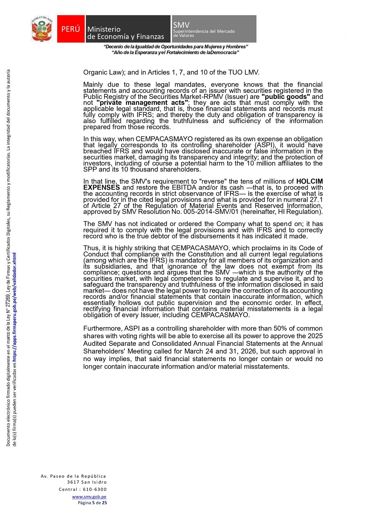 PERÚ Av. Pa s eo de la Re pú bl i ca 3 617 S a n I s i dr o C entr a l : 610 - 630 0 www.smv.gob.pe Página 5 de 25 Ministerio de Economía y Finanzas SMV Superintendencia del Mercado de Valores “Decenio de la Igualdad de Oportunidades para Mujeresy Hombres” “Año de la Esperanza yel Fortalecimiento de laDemocracia” Organic Law) ; and in Articles 1 , 7 , and 10 of the TUO LMV . Mainly due to these legal mandates, everyone knows that the financial statements and accounting records of an issuer with securities registered in the Public Registry of the Securities Market - RPMV (Issuer) are "public goods" and not "private management acts" ; they are acts that must comply with the applicable legal standard, that is, those financial statements and records must fully comply with IFRS ; and thereby the duty and obligation of transparency is also fulfilled regarding the truthfulness and sufficiency of the information prepared from those records . In this way, when CEMPACASMAYO registered as its own expense an obligation that legally corresponds to its controlling shareholder (ASPI), it would have breached IFRS and would have disclosed inaccurate or false information in the securities market, damaging its transparency and integrity ; and the protection of investors, including of course a potential harm to the 10 million affiliates to the SPP and its 10 thousand shareholders . In that line, the SMV's requirement to "reverse" the tens of millions of HOLCIM EXPENSES and restore the EBITDA and/or its cash — that is, to proceed with the accounting records in strict observance of IFRS — is the exercise of what is provided for in the cited legal provisions and what is provided for in numeral 27 . 1 of Article 27 of the Regulation of Material Events and Reserved Information, approved by SMV Resolution No . 005 - 2014 - SMV/ 01 (hereinafter, HI Regulation) . The SMV has not indicated or ordered the Company what to spend on ; it has required it to comply with the legal provisions and with IFRS and to correctly record who is the true debtor of the disbursements it has indicated it made . Thus, it is highly striking that CEMPACASMAYO, which proclaims in its Code of Conduct that compliance with the Constitution and all current legal regulations (among which are the IFRS) is mandatory for all members of its organization and its subsidiaries, and that ignorance of the law does not exempt from its compliance ; questions and argues that the SMV — which is the authority of the securities market, with legal competencies to regulate and supervise it, and to safeguard the transparency and truthfulness of the information disclosed in said market — does not have the legal power to require the correction of its accounting records and/or financial statements that contain inaccurate information, which essentially hollows out public supervision and the economic order . In effect, rectifying financial information that contains material misstatements is a legal obligation of every Issuer, including CEMPACASMAYO . Furthermore, ASPI as a controlling shareholder with more than 50 % of common shares with voting rights will be able to exercise all its power to approve the 2025 Audited Separate and Consolidated Annual Financial Statements at the Annual Shareholders' Meeting called for March 24 and 31 , 2026 , but such approval in no way implies, that said financial statements no longer contain or would no longer contain inaccurate information and/or material misstatements .