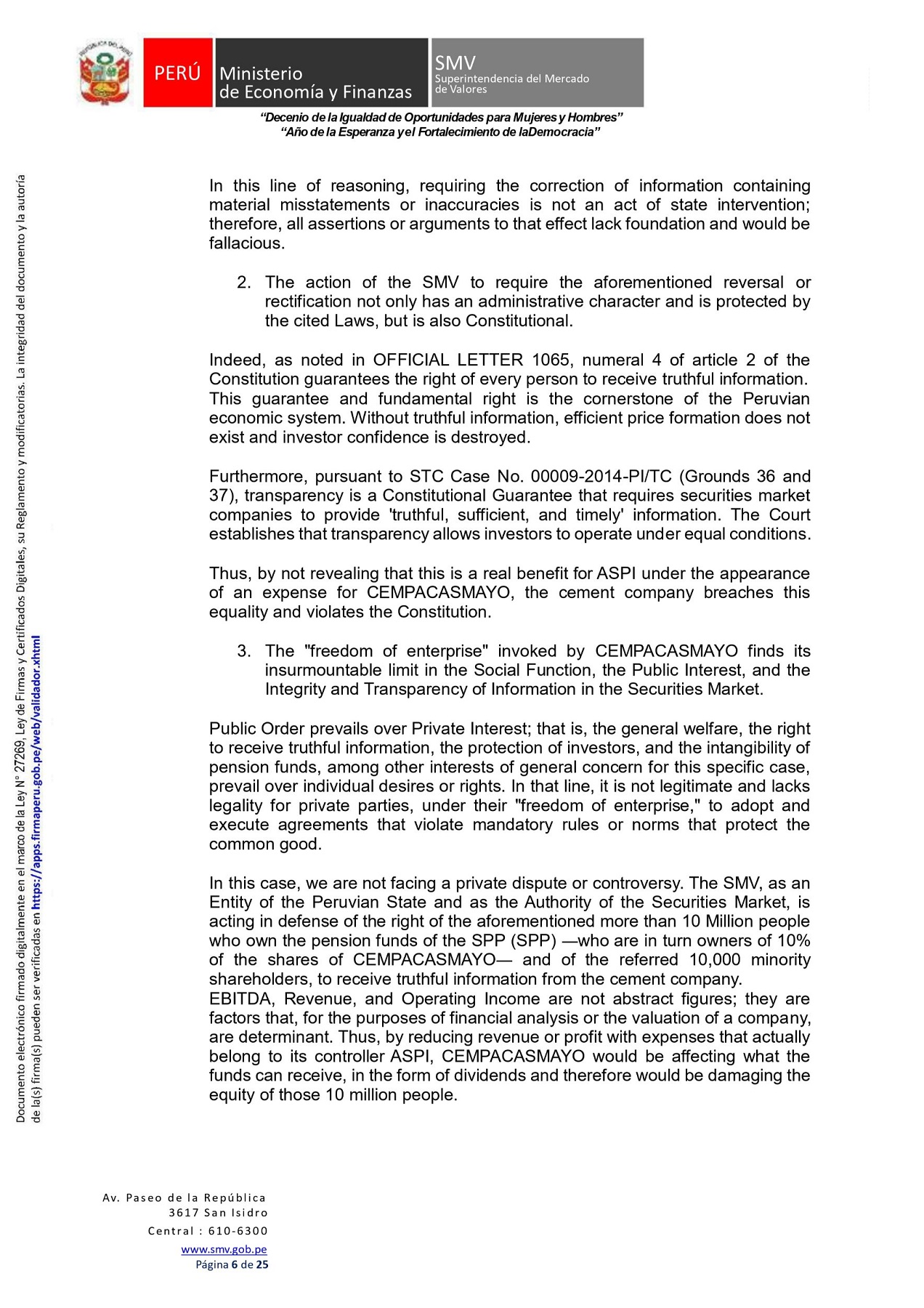 PERÚ Av. Pa s eo de la Re pú bl i ca 3 617 S a n I s i dr o C entr a l : 610 - 630 0 www.smv.gob.pe Página 6 de 25 Ministerio de Economía y Finanzas SMV Superintendencia del Mercado de Valores “Decenio de la Igualdad de Oportunidades para Mujeresy Hombres” “Año de la Esperanza yel Fortalecimiento de laDemocracia” In this line of reasoning, requiring the correction of information containing material misstatements or inaccuracies is not an act of state intervention ; therefore, all assertions or arguments to that effect lack foundation and would be fallacious . 2. The action of the SMV to require the aforementioned reversal or rectification not only has an administrative character and is protected by the cited Laws, but is also Constitutional . Indeed, as noted in OFFICIAL LETTER 1065 , numeral 4 of article 2 of the Constitution guarantees the right of every person to receive truthful information . This guarantee and fundamental right is the cornerstone of the Peruvian economic system . Without truthful information, efficient price formation does not exist and investor confidence is destroyed . Furthermore, pursuant to STC Case No . 00009 - 2014 - PI/TC (Grounds 36 and 37 ), transparency is a Constitutional Guarantee that requires securities market companies to provide 'truthful, sufficient, and timely' information . The Court establishes that transparency allows investors to operate under equal conditions . Thus, by not revealing that this is a real benefit for ASPI under the appearance of an expense for CEMPACASMAYO, the cement company breaches this equality and violates the Constitution . 3. The "freedom of enterprise" invoked by CEMPACASMAYO finds its insurmountable limit in the Social Function, the Public Interest, and the Integrity and Transparency of Information in the Securities Market . Public Order prevails over Private Interest ; that is, the general welfare, the right to receive truthful information, the protection of investors, and the intangibility of pension funds, among other interests of general concern for this specific case, prevail over individual desires or rights . In that line, it is not legitimate and lacks legality for private parties, under their "freedom of enterprise," to adopt and execute agreements that violate mandatory rules or norms that protect the common good . In this case, we are not facing a private dispute or controversy . The SMV, as an Entity of the Peruvian State and as the Authority of the Securities Market, is acting in defense of the right of the aforementioned more than 10 Million people who own the pension funds of the SPP (SPP) — who are in turn owners of 10 % of the shares of CEMPACASMAYO — and of the referred 10 , 000 minority shareholders, to receive truthful information from the cement company . EBITDA, Revenue, and Operating Income are not abstract figures ; they are factors that, for the purposes of financial analysis or the valuation of a company, are determinant . Thus, by reducing revenue or profit with expenses that actually belong to its controller ASPI, CEMPACASMAYO would be affecting what the funds can receive, in the form of dividends and therefore would be damaging the equity of those 10 million people .