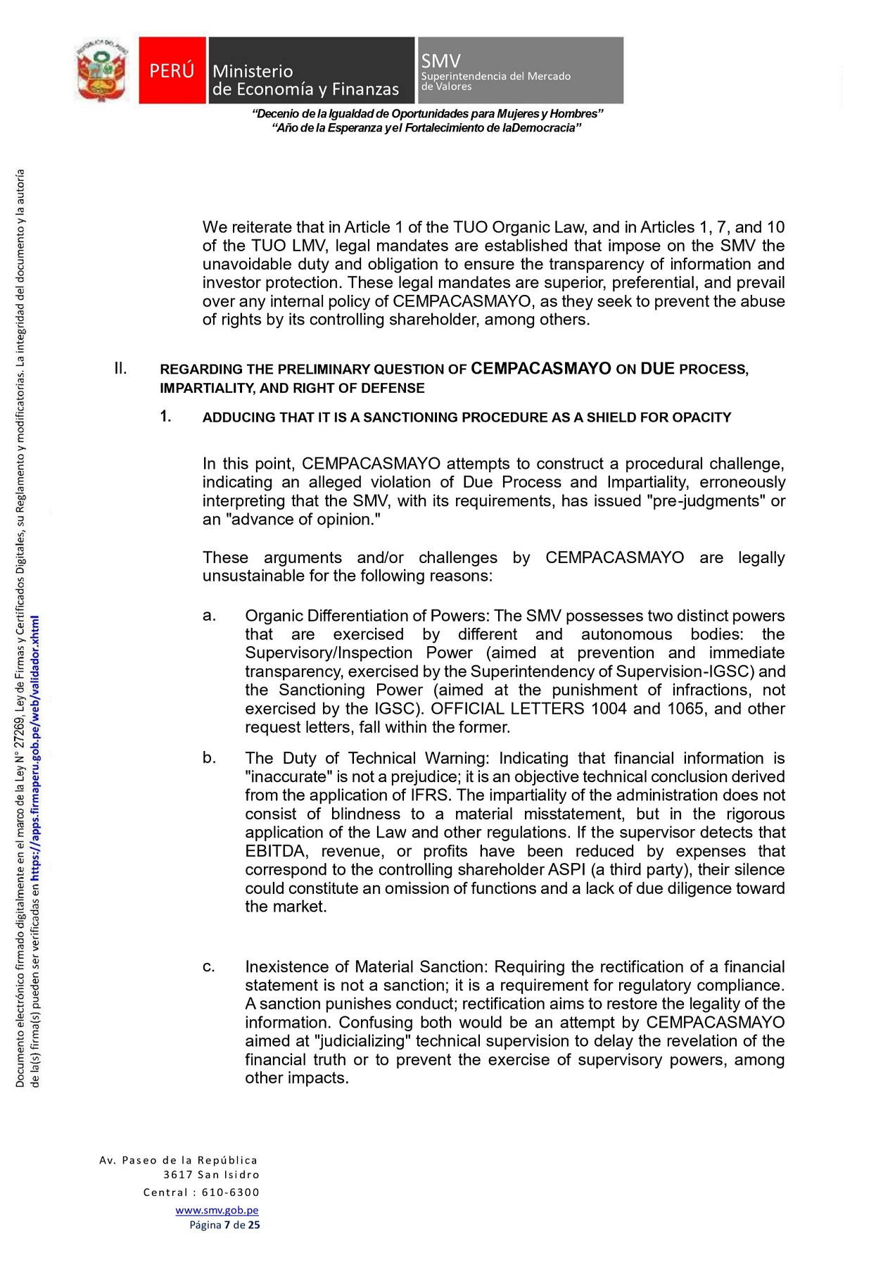 PERÚ Ministerio de Economía y Finanzas Av. Pa s eo de la Re pú bl i ca 3 617 S a n I s i dr o C entr a l : 610 - 630 0 www.smv.gob.pe Página 7 de 25 SMV Superintendencia del Mercado de Valores “Decenio de la Igualdad de Oportunidades para Mujeresy Hombres” “Año de la Esperanza yel Fortalecimiento de laDemocracia” We reiterate that in Article 1 of the TUO Organic Law, and in Articles 1 , 7 , and 10 of the TUO LMV, legal mandates are established that impose on the SMV the unavoidable duty and obligation to ensure the transparency of information and investor protection . These legal mandates are superior, preferential, and prevail over any internal policy of CEMPACASMAYO, as they seek to prevent the abuse of rights by its controlling shareholder, among others . II. REGARDING THE PRELIMINARY QUESTION OF CEMPACASMAYO ON DUE PROCESS, IMPARTIALITY, AND RIGHT OF DEFENSE 1. ADDUCING THAT IT IS A SANCTIONING PROCEDURE AS A SHIELD FOR OPACITY In this point, CEMPACASMAYO attempts to construct a procedural challenge, indicating an alleged violation of Due Process and Impartiality, erroneously interpreting that the SMV, with its requirements, has issued "pre - judgments" or an "advance of opinion . " These arguments and/or challenges by CEMPACASMAYO are legally unsustainable for the following reasons : a. Organic Differentiation of Powers : The SMV possesses two distinct powers that are exercised by different and autonomous bodies : the Supervisory/Inspection Power (aimed at prevention and immediate transparency, exercised by the Superintendency of Supervision - IGSC) and the Sanctioning Power (aimed at the punishment of infractions, not exercised by the IGSC) . OFFICIAL LETTERS 1004 and 1065 , and other request letters, fall within the former . b . The Duty of Technical Warning : Indicating that financial information is "inaccurate" is not a prejudice ; it is an objective technical conclusion derived from the application of IFRS . The impartiality of the administration does not consist of blindness to a material misstatement, but in the rigorous application of the Law and other regulations . If the supervisor detects that EBITDA, revenue, or profits have been reduced by expenses that correspond to the controlling shareholder ASPI (a third party), their silence could constitute an omission of functions and a lack of due diligence toward the market . c. Inexistence of Material Sanction : Requiring the rectification of a financial statement is not a sanction ; it is a requirement for regulatory compliance . A sanction punishes conduct ; rectification aims to restore the legality of the information . Confusing both would b e a n attempt b y CEMPACASMAYO aimed at "judicializing" technical supervision to delay the revelation of the financial truth or to prevent the exercise of supervisory powers, a m o n g other impacts .