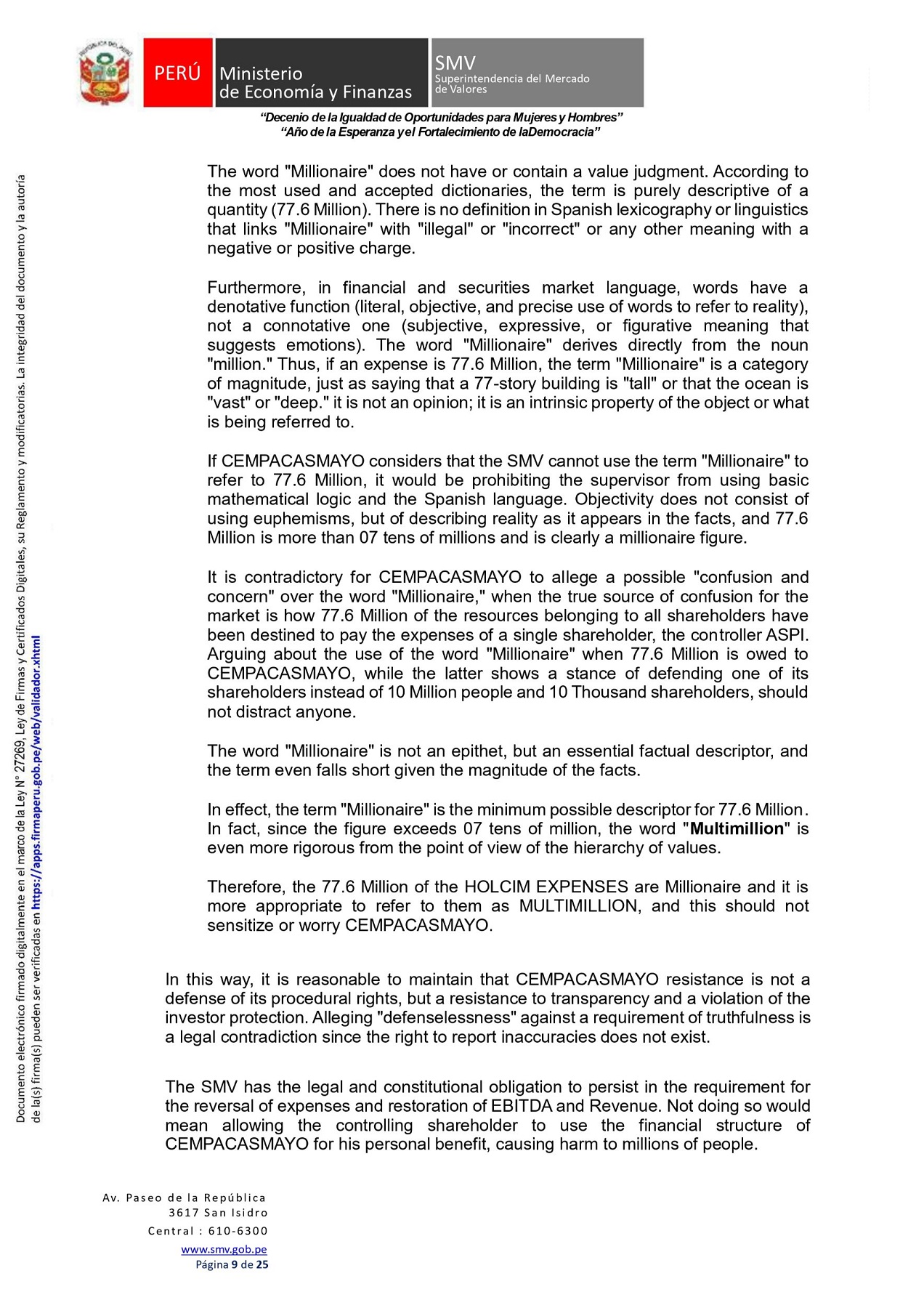 PERÚ Ministerio de Economía y Finanzas Av. Pa s eo de la Re pú bl i ca 3 617 S a n I s i dr o C entr a l : 610 - 630 0 www.smv.gob.pe Página 9 de 25 SMV Superintendencia del Mercado de Valores “Decenio de la Igualdad de Oportunidades para Mujeresy Hombres” “Año de la Esperanza yel Fortalecimiento de laDemocracia” The word "Millionaire" does not have or contain a value judgment . According to the most used and accepted dictionaries, the term is purely descriptive of a quantity ( 77 . 6 Million) . There is no definition in Spanish lexicography or linguistics that links "Millionaire" with "illegal" or "incorrect" or any other meaning with a negative or positive charge . Furthermore, in financial and securities market language, words have a denotative function (literal, objective, and precise use of words to refer to reality), not a connotative one (subjective, expressive, or figurative meaning that suggests emotions) . The word "Millionaire" derives directly from the noun "million . " Thus, if an expense is 77 . 6 Million, the term "Millionaire" is a category of magnitude, just as saying that a 77 - story building is "tall" or that the ocean is "vast" or "deep . " it is not an opinion ; it is an intrinsic property of the object or what is being referred to . If CEMPACASMAYO considers that the SMV cannot use the term "Millionaire" to refer to 77 . 6 Million, it would be prohibiting the supervisor from using basic mathematical logic and the Spanish language . Objectivity does not consist of using euphemisms, but of describing reality as it appears in the facts, and 77 . 6 Million is more than 07 tens of millions and is clearly a millionaire figure . It is contradictory for CEMPACASMAYO to allege a possible "confusion and concern" over the word "Millionaire," when the true source of confusion for the market is how 77 . 6 Million of the resources belonging to all shareholders have been destined to pay the expenses of a single shareholder, the controller ASPI . Arguing about the use of the word "Millionaire" when 77 . 6 Million is owed to CEMPACASMAYO, while the latter shows a stance of defending one of its shareholders instead of 10 Million people and 10 Thousand shareholders, should not distract anyone . The word "Millionaire" is not an epithet, but an essential factual descriptor, and the term even falls short given the magnitude of the facts . In effect, the term "Millionaire" is the minimum possible descriptor for 77 . 6 Million . In fact, since the figure exceeds 07 tens of million, the word " Multimillion " is even more rigorous from the point of view of the hierarchy of values . Therefore, the 77 . 6 Million of the HOLCIM EXPENSES are Millionaire and it is more appropriate to refer to them as MULTIMILLION, and this should not sensitize or worry CEMPACASMAYO . In this way, it is reasonable to maintain that CEMPACASMAYO resistance is not a defense of its procedural rights, but a resistance to transparency and a violation of the investor protection . Alleging "defenselessness" against a requirement of truthfulness is a legal contradiction since the right to report inaccuracies does not exist . The SMV has the legal and constitutional obligation to persist in the requirement for the reversal of expenses and restoration of EBITDA and Revenue . Not doing so would mean allowing the controlling shareholder to use the financial structure of CEMPACASMAYO for his personal benefit, causing harm to millions of people .