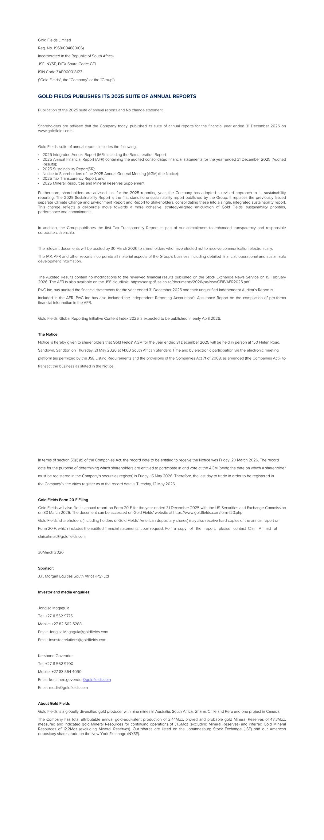 Gold Fields Limited Reg. No. 1968/004880/06) Incorporated in the Republic of South Africa) JSE, NYSE, DIFX Share Code: GFI ISIN Code:ZAE000018123 ("Gold Fields", the "Company" or the "Group") GOLD FIELDS PUBLISHES ITS 2025 SUITE OF ANNUAL REPORTS Publication of the 2025 suite of annual reports and No change statement Shareholders are advised that the Company today, published its suite of annual reports for the financial year ended 31 December 2025 on www.goldfields.com. Gold Fields' suite of annual reports includes the following: • 2025 Integrated Annual Report (IAR), including the Remuneration Report • 2025 Annual Financial Report (AFR) containing the audited consolidated financial statements for the year ended 31 December 2025 (Audited Results); • 2025 Sustainability Report(SR); • Notice to Shareholders of the 2025 Annual General Meeting (AGM) (the Notice); • 2025 Tax Transparency Report; and • 2025 Mineral Resources and Mineral Reserves Supplement Furthermore, shareholders are advised that for the 2025 reporting year, the Company has adopted a revised approach to its sustainability reporting. The 2025 Sustainability Report is the first standalone sustainability report published by the Group. It replaces the previously issued separate Climate Change and Environment Report and Report to Stakeholders, consolidating these into a single, integrated sustainability report. This change reflects a deliberate move towards a more cohesive, strategy-aligned articulation of Gold Fields’ sustainability priorities, performance and commitments. In addition, the Group publishes the first Tax Transparency Report as part of our commitment to enhanced transparency and responsible corporate citizenship. The relevant documents will be posted by 30 March 2026 to shareholders who have elected not to receive communication electronically. The IAR, AFR and other reports incorporate all material aspects of the Group's business including detailed financial, operational and sustainable development information. The Audited Results contain no modifications to the reviewed financial results published on the Stock Exchange News Service on 19 February 2026. The AFR is also available on the JSE cloudlink: https://senspdf.jse.co.za/documents/2026/jse/isse/GFIE/AFR2025.pdf PwC Inc. has audited the financial statements for the year ended 31 December 2025 and their unqualified Independent Auditor's Report is included in the AFR. PwC Inc has also included the Independent Reporting Accountant's Assurance Report on the compilation of pro-forma financial information in the AFR. Gold Fields' Global Reporting Initiative Content Index 2026 is expected to be published in early April 2026. The Notice Notice is hereby given to shareholders that Gold Fields' AGM for the year ended 31 December 2025 will be held in person at 150 Helen Road, Sandown, Sandton on Thursday, 21 May 2026 at 14:00 South African Standard Time and by electronic participation via the electronic meeting platform (as permitted by the JSE Listing Requirements and the provisions of the Companies Act 71 of 2008, as amended (the Companies Act)), to transact the business as stated in the Notice. In terms of section 59(1) (b) of the Companies Act, the record date to be entitled to receive the Notice was Friday, 20 March 2026. The record date for the purpose of determining which shareholders are entitled to participate in and vote at the AGM (being the date on which a shareholder must be registered in the Company's securities register) is Friday, 15 May 2026. Therefore, the last day to trade in order to be registered in the Company's securities register as at the record date is Tuesday, 12 May 2026. Gold Fields Form 20-F Filing Gold Fields will also file its annual report on Form 20-F for the year ended 31 December 2025 with the US Securities and Exchange Commission on 30 March 2026. The document can be accessed on Gold Fields' website at https://www.goldfields.com/form-f20.php Gold Fields' shareholders (including holders of Gold Fields' American depositary shares) may also receive hard copies of the annual report on Form 20-F, which includes the audited financial statements, upon request. For a copy of the report, please contact Clair Ahmad at clair.ahmad@goldfields.com 30March 2026 Sponsor: J.P. Morgan Equities South Africa (Pty) Ltd Investor and media enquiries: Jongisa Magagula Tel: +27 11 562 9775 Mobile: +27 82 562 5288 Email: Jongisa.Magagula@goldfields.com Email: investor.relations@goldfields.com Kershnee Govender Tel: +27 11 562 9700 Mobile: +27 83 564 4090 Email: kershnee.govender@goldfields.com Email: media@goldfields.com About Gold Fields Gold Fields is a globally diversified gold producer with nine mines in Australia, South Africa, Ghana, Chile and Peru and one project in Canada. The Company has total attributable annual gold-equivalent production of 2.44Moz, proved and probable gold Mineral Reserves of 48.3Moz, measured and indicated gold Mineral Resources for continuing operations of 31.6Moz (excluding Mineral Reserves) and inferred Gold Mineral Resources of 12.2Moz (excluding Mineral Reserves). Our shares are listed on the Johannesburg Stock Exchange (JSE) and our American depositary shares trade on the New York Exchange (NYSE).