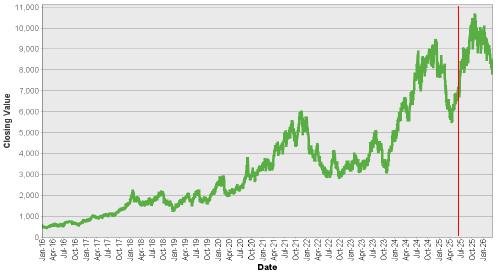 The closing value of the S&P 500 Futures 40% Intraday Edge Volatility TCA 6% Decrement Index (USD) ER on March 23, 2026 was 7,961.15. The graph below shows the hypothetical back-tested closing values of the S&P 500 Futures 40% Intraday Edge Volatility TCA 6% Decrement Index (USD) ER for the period from January 4, 2016 to August 13, 2025, and historical closing values of the S&P 500 Futures 40% Intraday Edge Volatility TCA 6% Decrement Index (USD) ER for the period from August 14, 2025 to March 23, 2026. All data to the left of the vertical red line in the graph below are hypothetical and back-tested. We obtained the closing values from Bloomberg L.P., without independent verification. You should not take the hypothetical back-tested and historical values of the S&P 500 Futures 40% Intraday Edge Volatility TCA 6% Decrement Index (USD) ER as an indication of future performance.