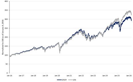 To illustrate the historical impact of the implicit financing cost on the performance of the S&P 500 Futures Excess Return Index, the following graph sets forth a comparison of the historical performance of the S&P 500 Futures Excess Return Index against the historical performance of the S&P 500® Index from January 4, 2016 through March 23, 2026, each normalized to have a closing value of 100.00 on January 4, 2016 to facilitate a comparison. The performance of the S&P 500® Index shown below is its price return performance – i.e., its performance without reflecting dividends. The total return performance of the S&P 500® Index (i.e., its performance reflecting dividends) would be greater than the price return performance shown below.