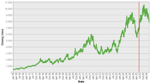 The closing value of the S&P 500 Futures 40% Intraday Edge Volatility TCA 6% Decrement Index (USD) ER on March 23, 2026 was 7,961.15. The graph below shows the hypothetical back-tested closing values of the S&P 500 Futures 40% Intraday Edge Volatility TCA 6% Decrement Index (USD) ER for the period from January 4, 2016 to August 13, 2025, and historical closing values of the S&P 500 Futures 40% Intraday Edge Volatility TCA 6% Decrement Index (USD) ER for the period from August 14, 2025 to March 23, 2026. All data to the left of the vertical red line in the graph below are hypothetical and back-tested. We obtained the closing values from Bloomberg L.P., without independent verification. You should not take the hypothetical back-tested and historical values of the S&P 500 Futures 40% Intraday Edge Volatility TCA 6% Decrement Index (USD) ER as an indication of future performance.